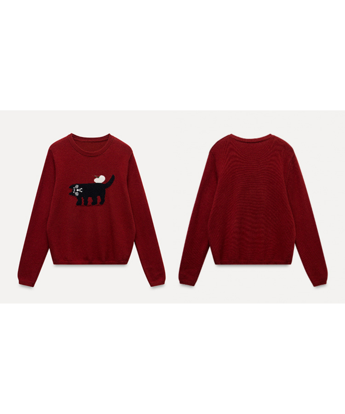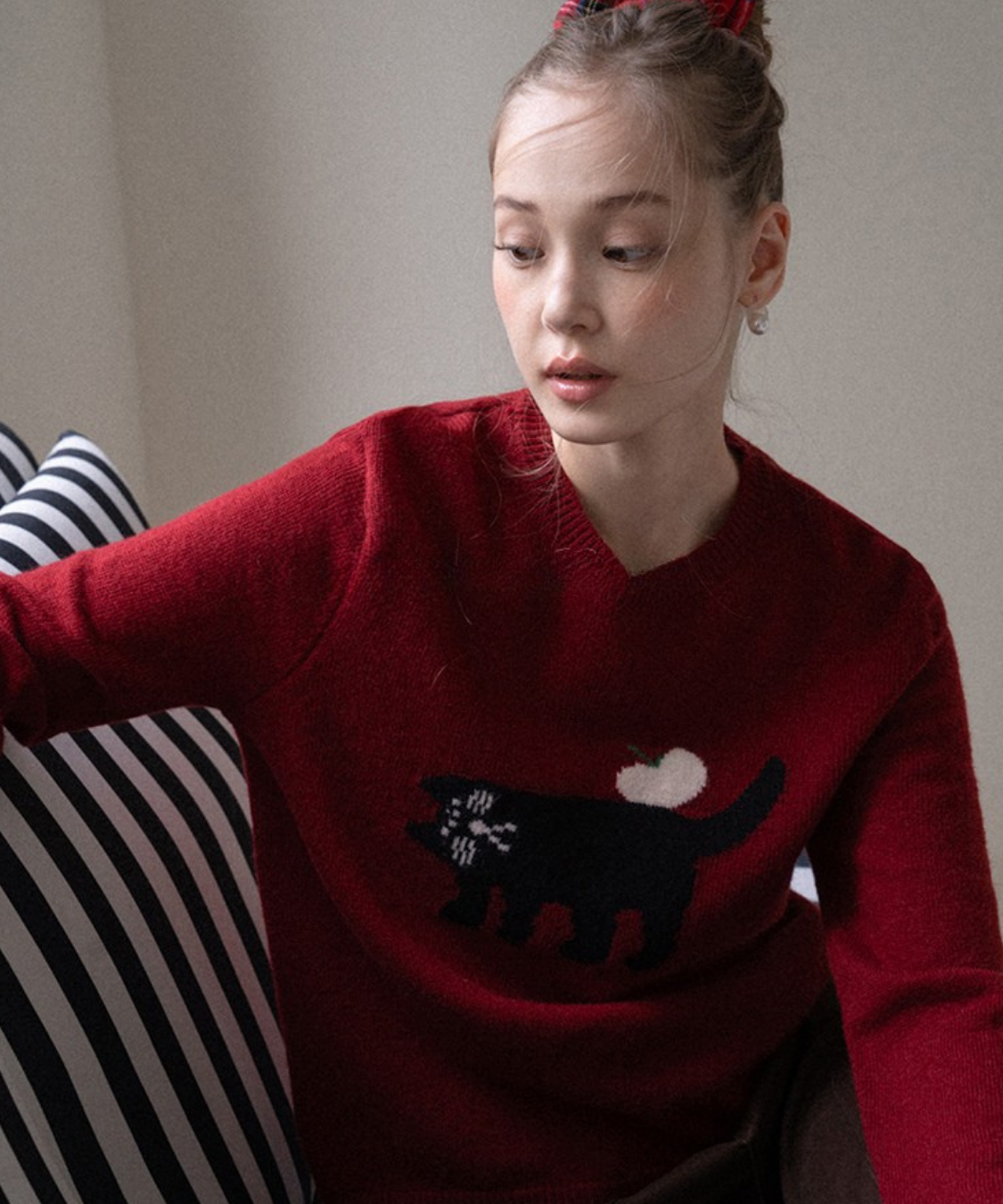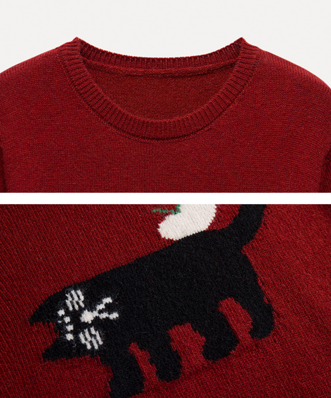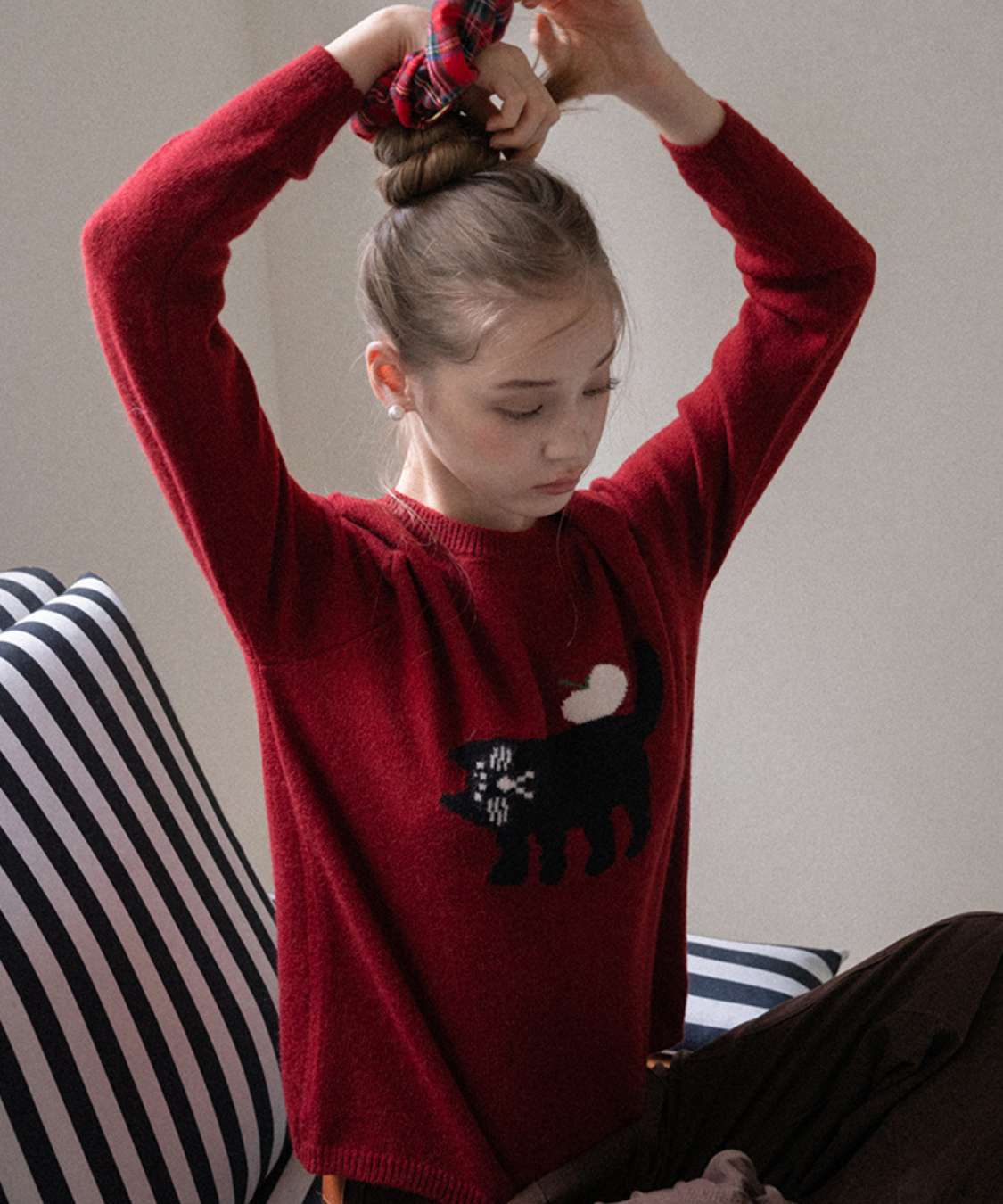 フロントにあしらわれた黒猫モチーフが印象的な、遊び心のあるニットです。