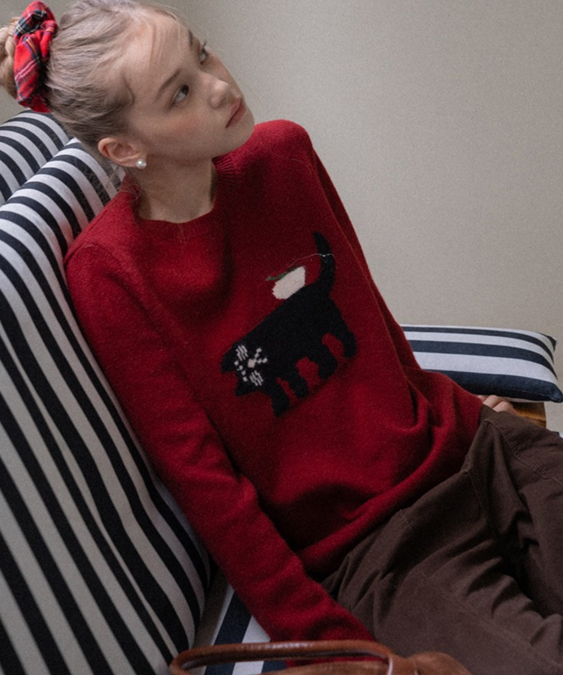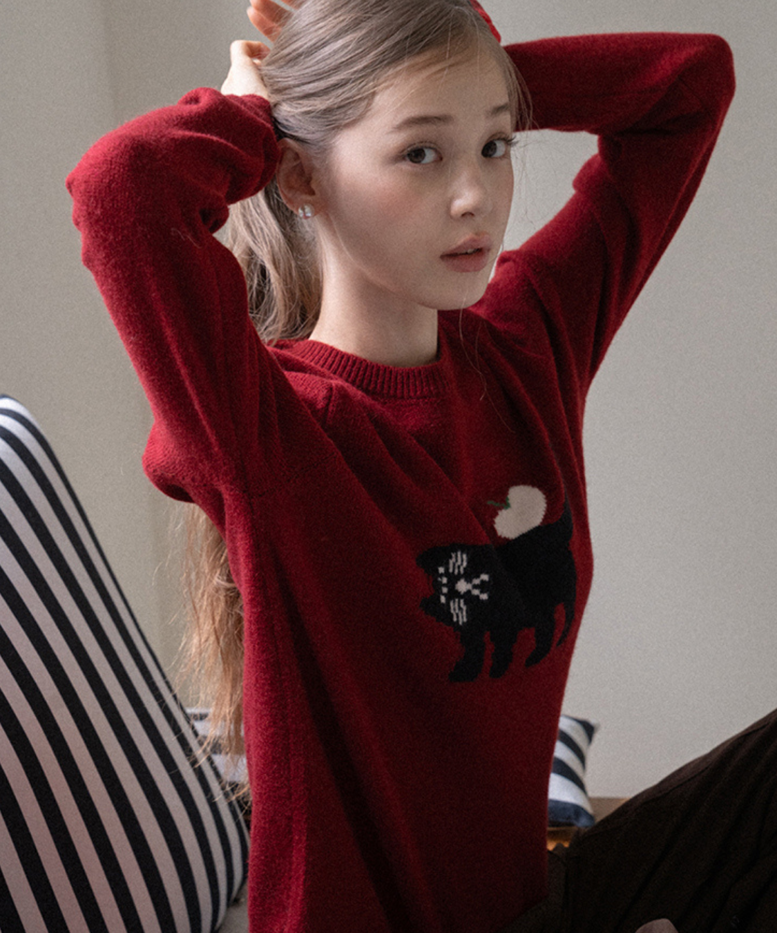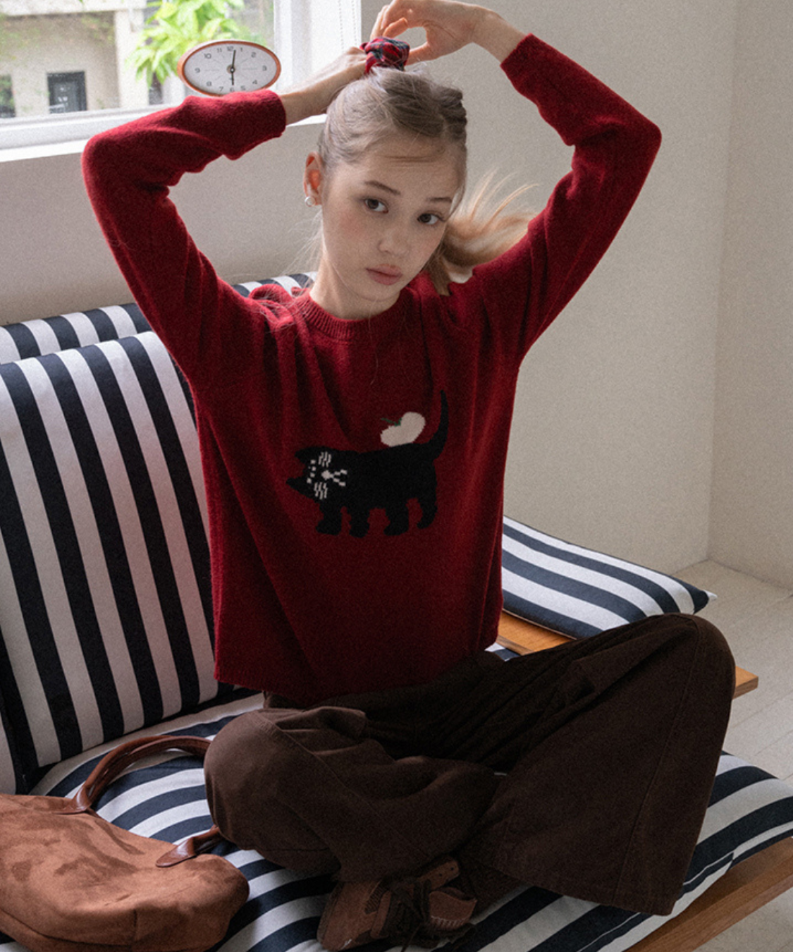 フロントにあしらわれた黒猫モチーフが印象的な、遊び心のあるニットです。