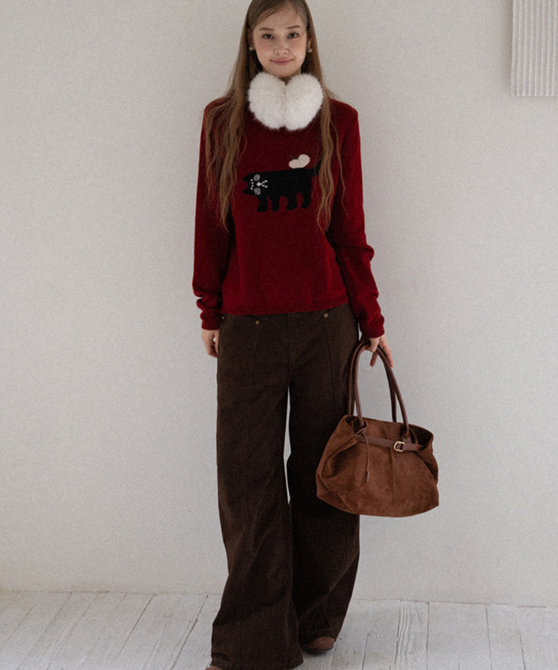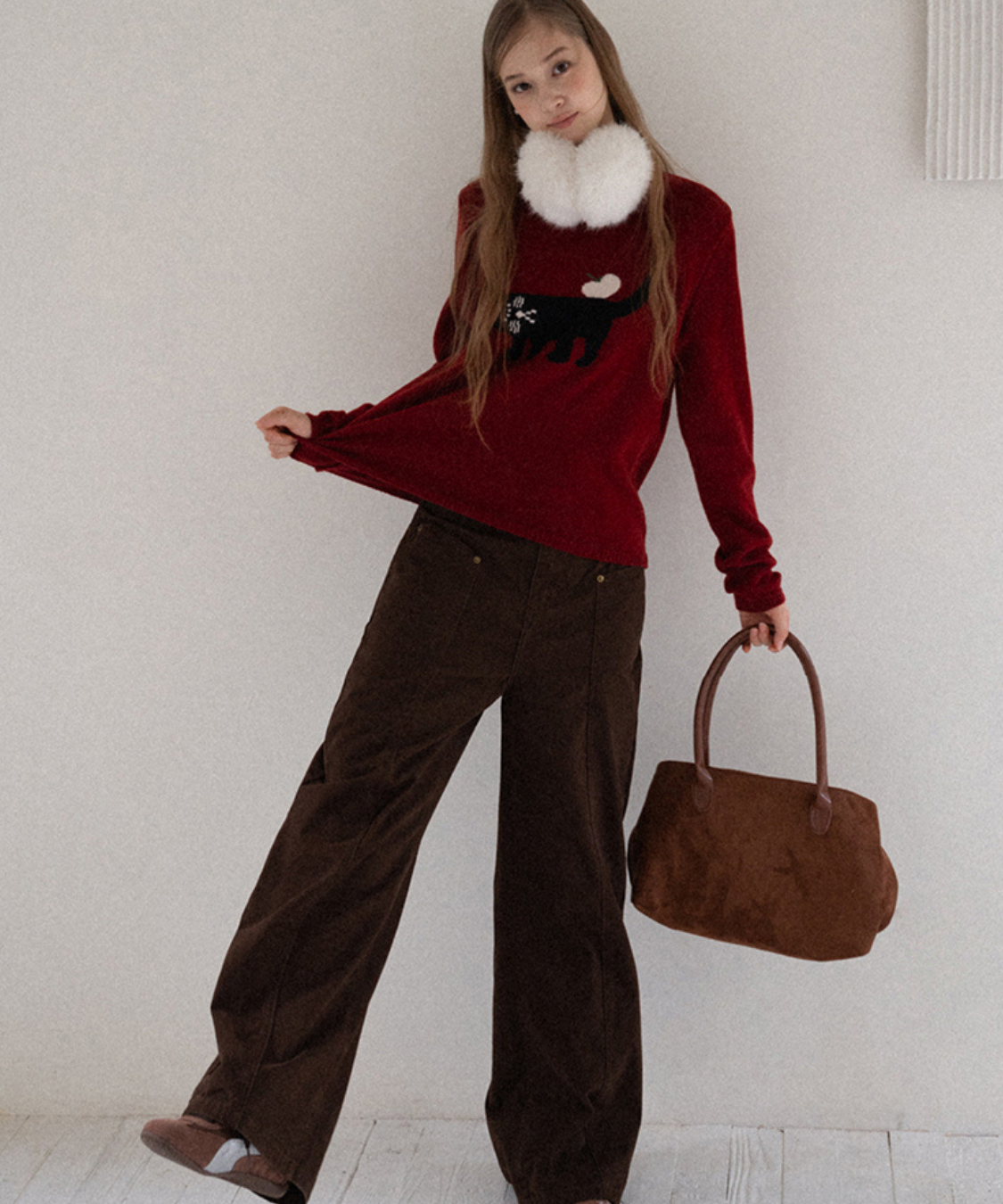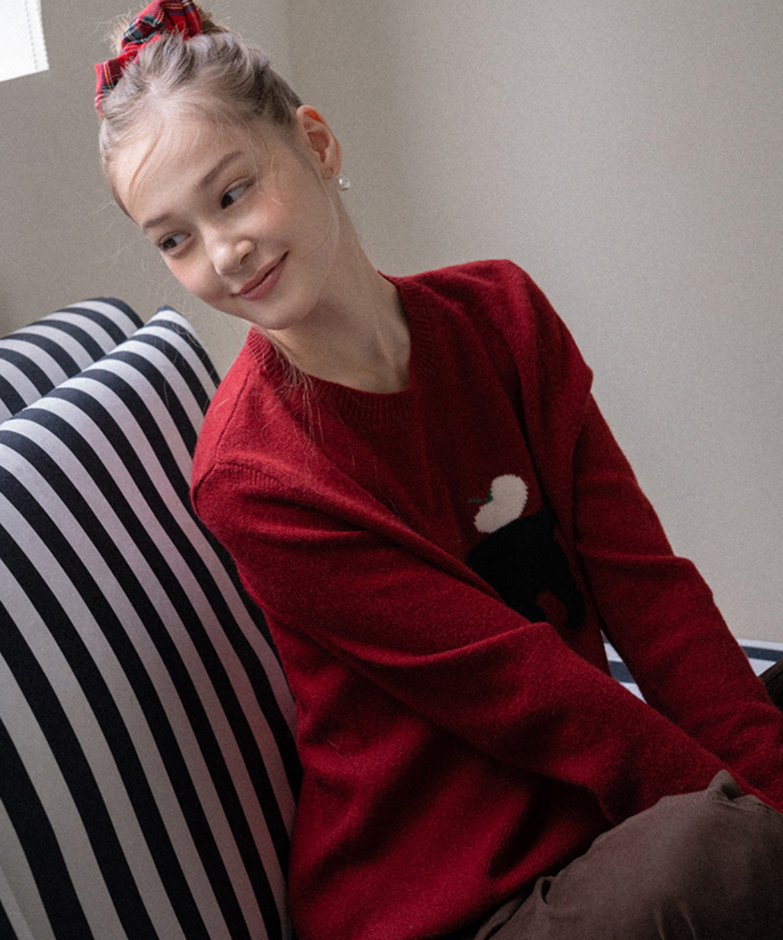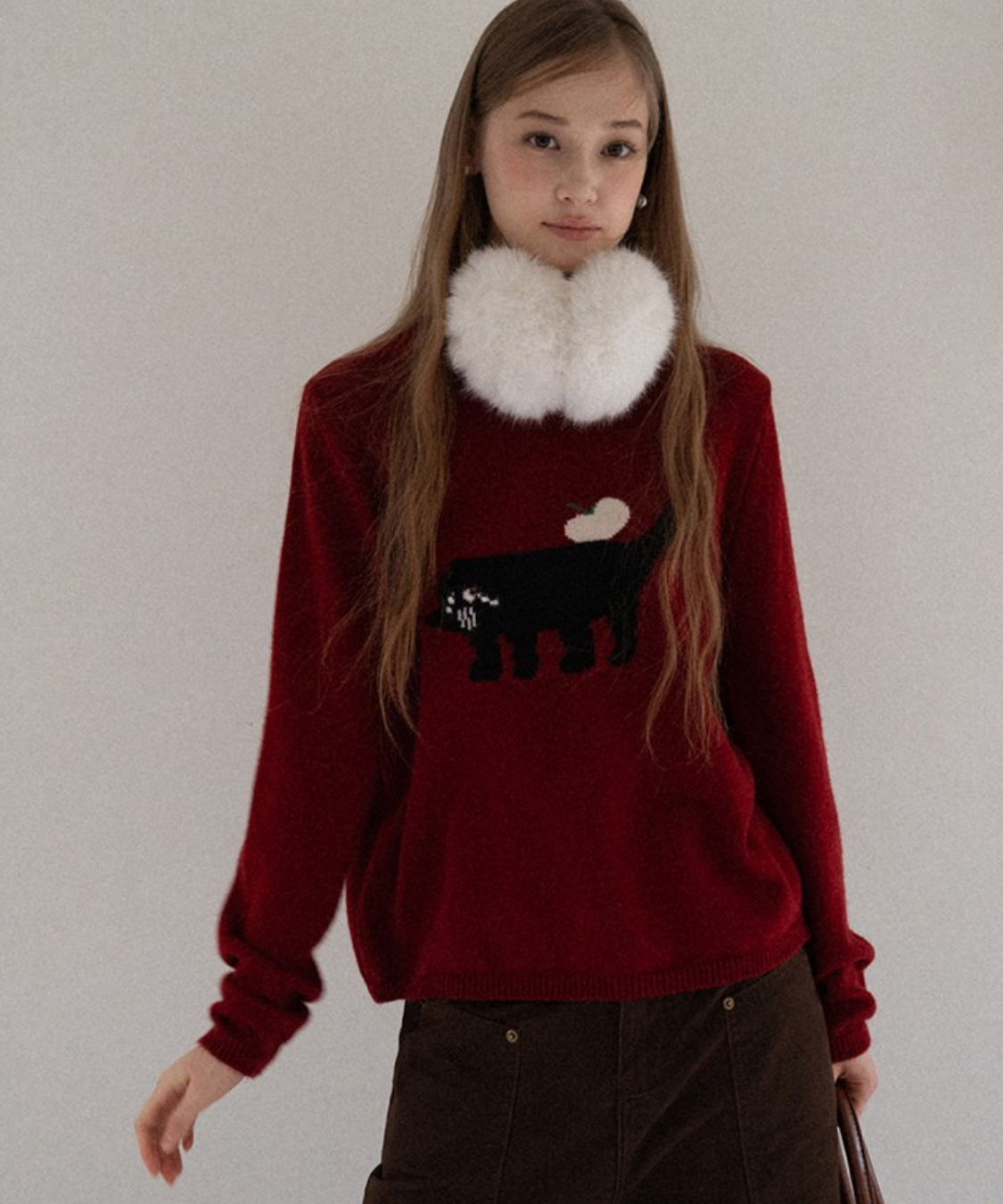 フロントにあしらわれた黒猫モチーフが印象的な、遊び心のあるニットです。