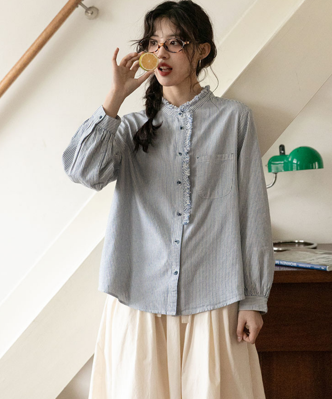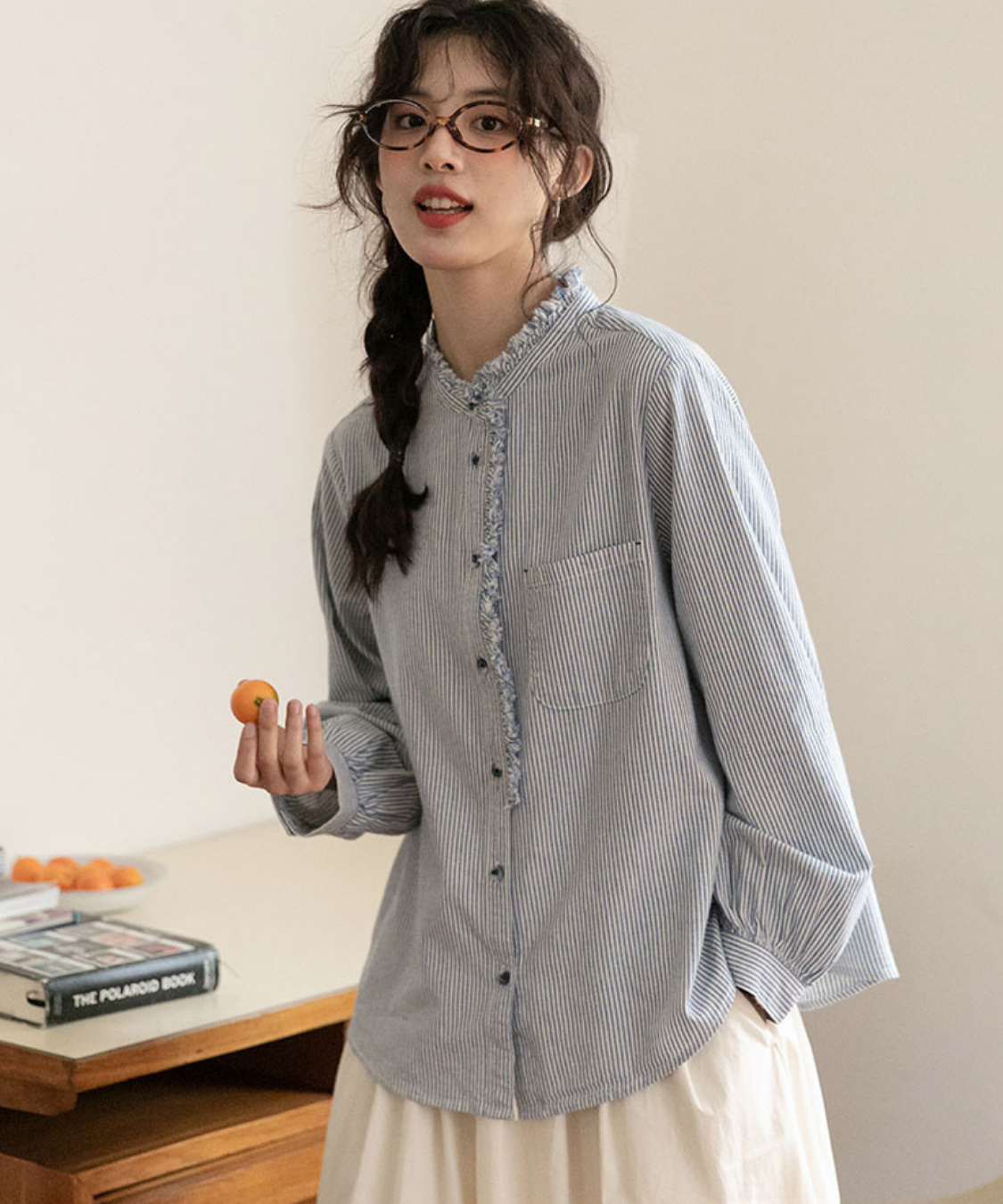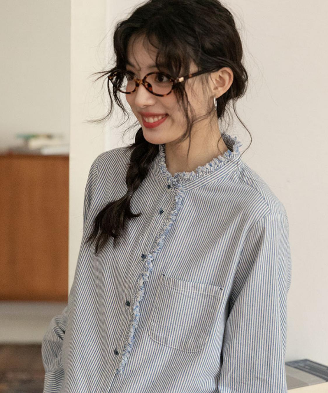 すっきりとしたスタンドネックに、フリンジのあしらいがさりげない可愛さを演出するブラウスです。