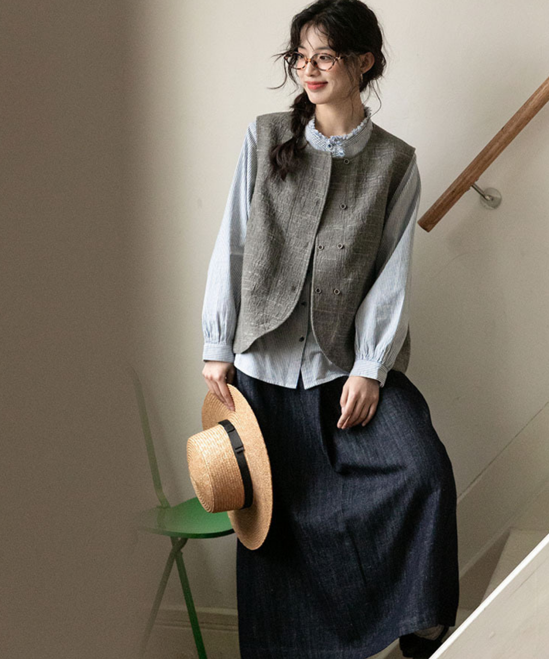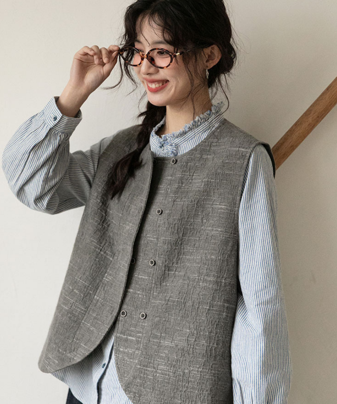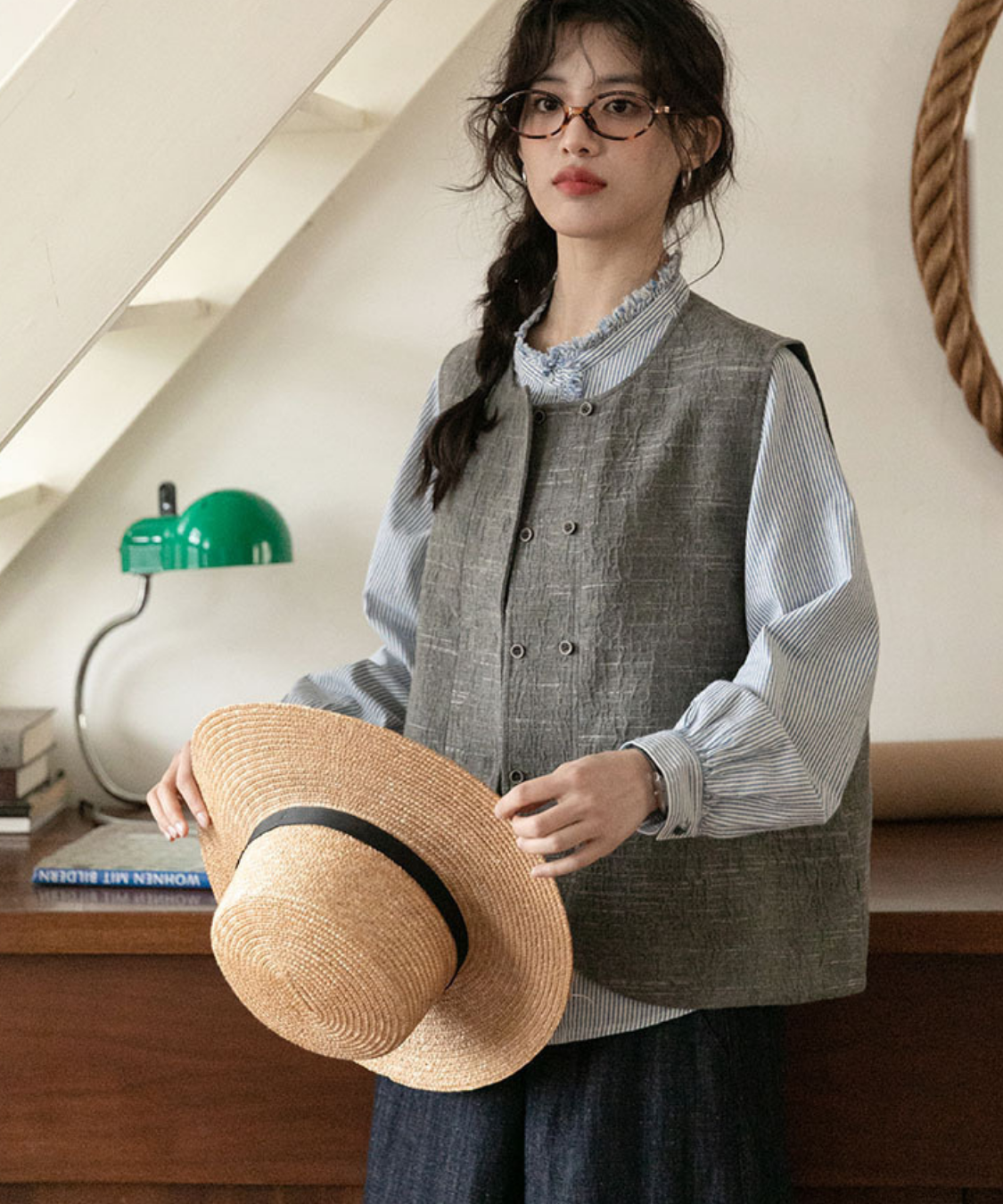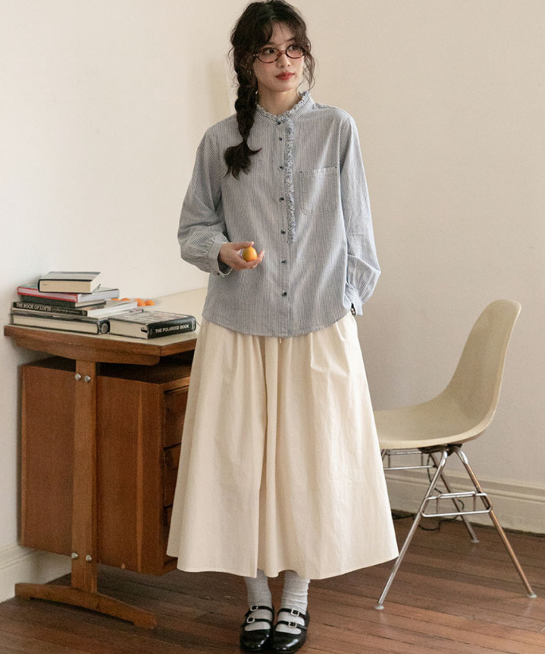 すっきりとしたスタンドネックに、フリンジのあしらいがさりげない可愛さを演出するブラウスです。