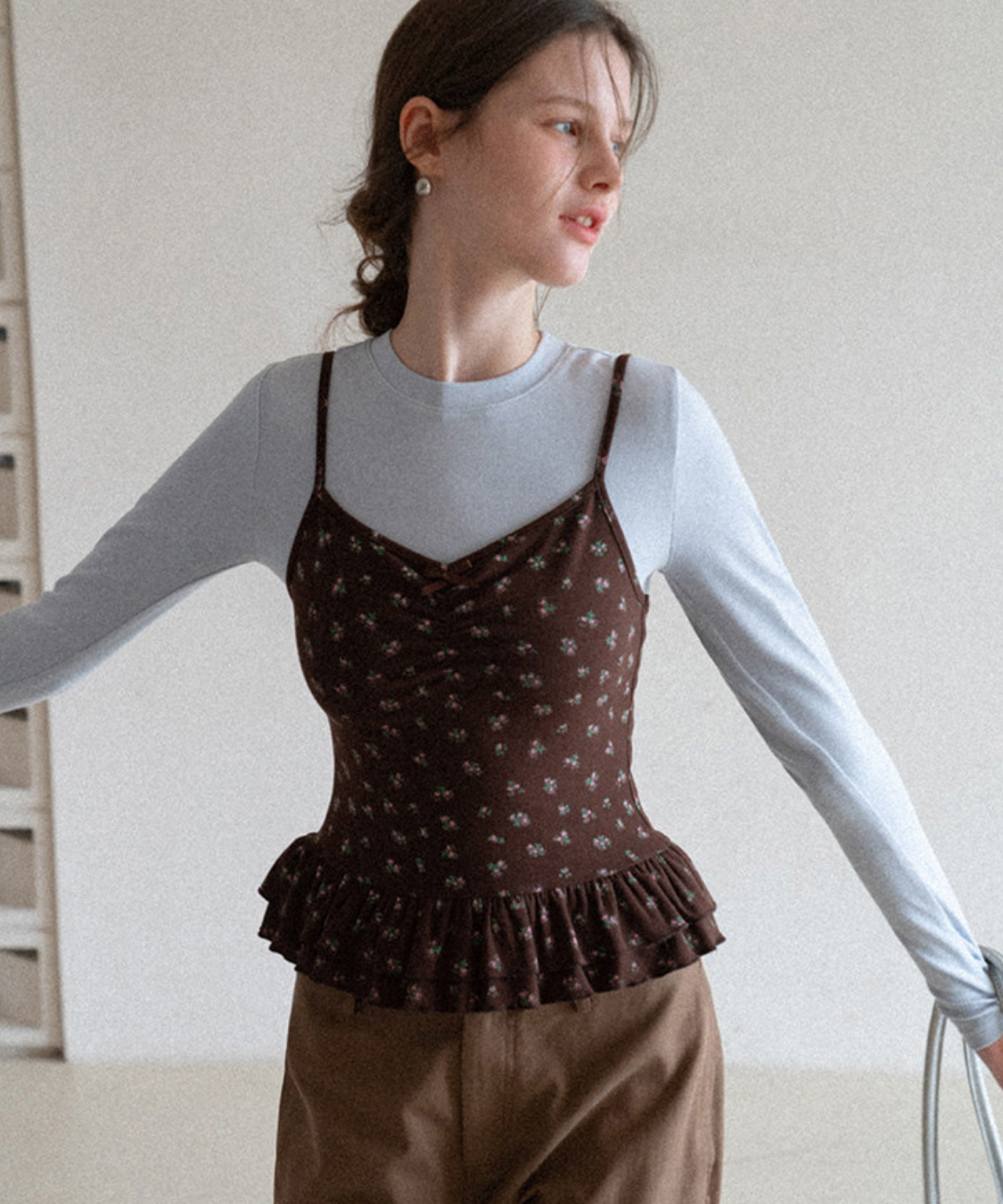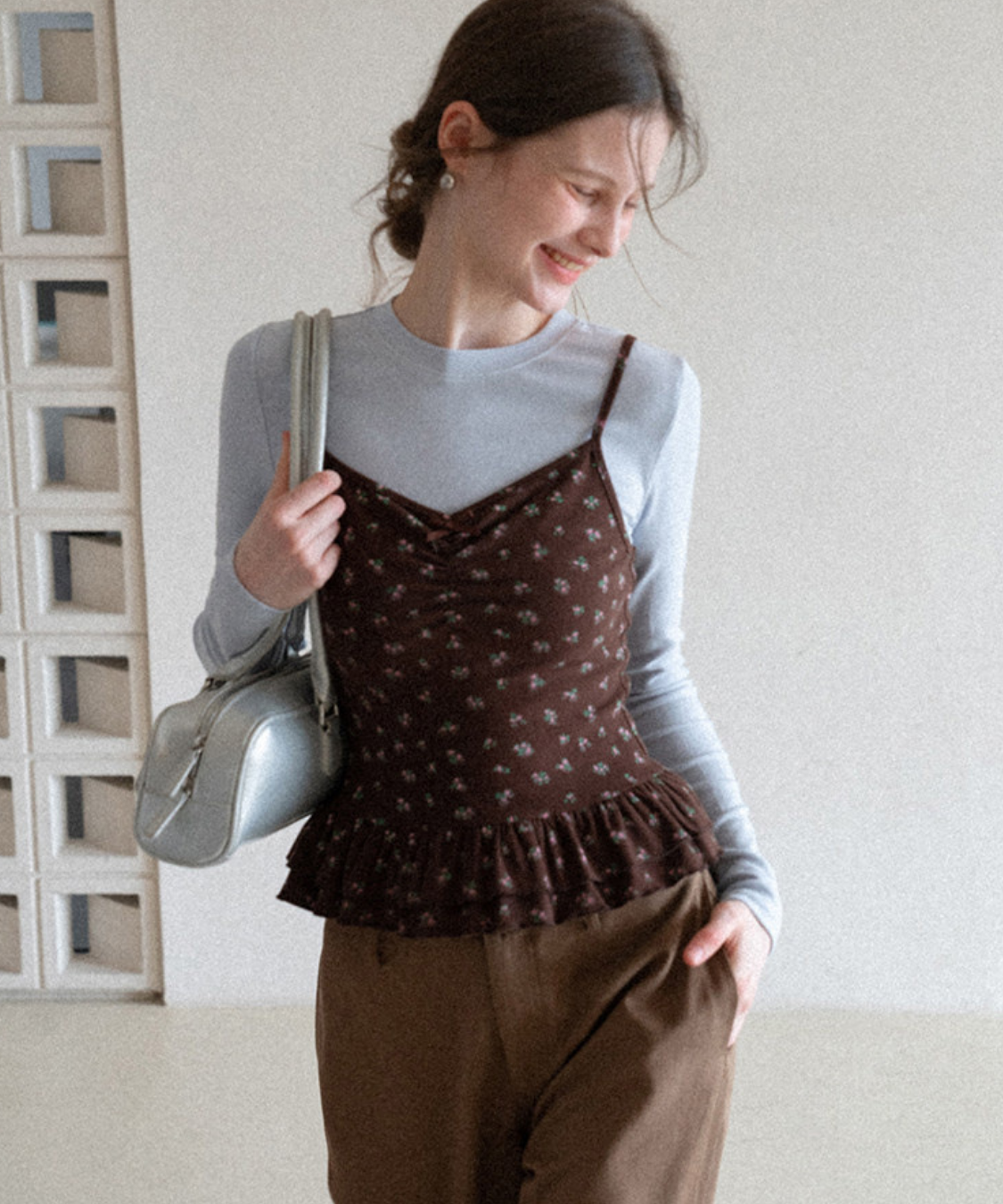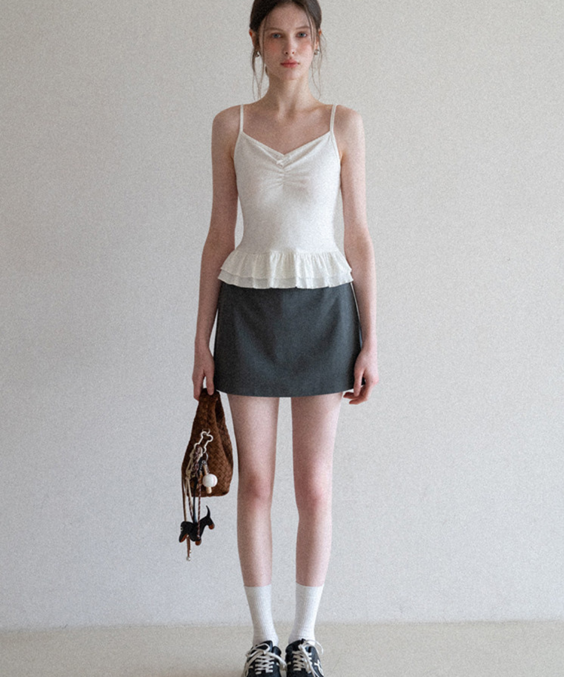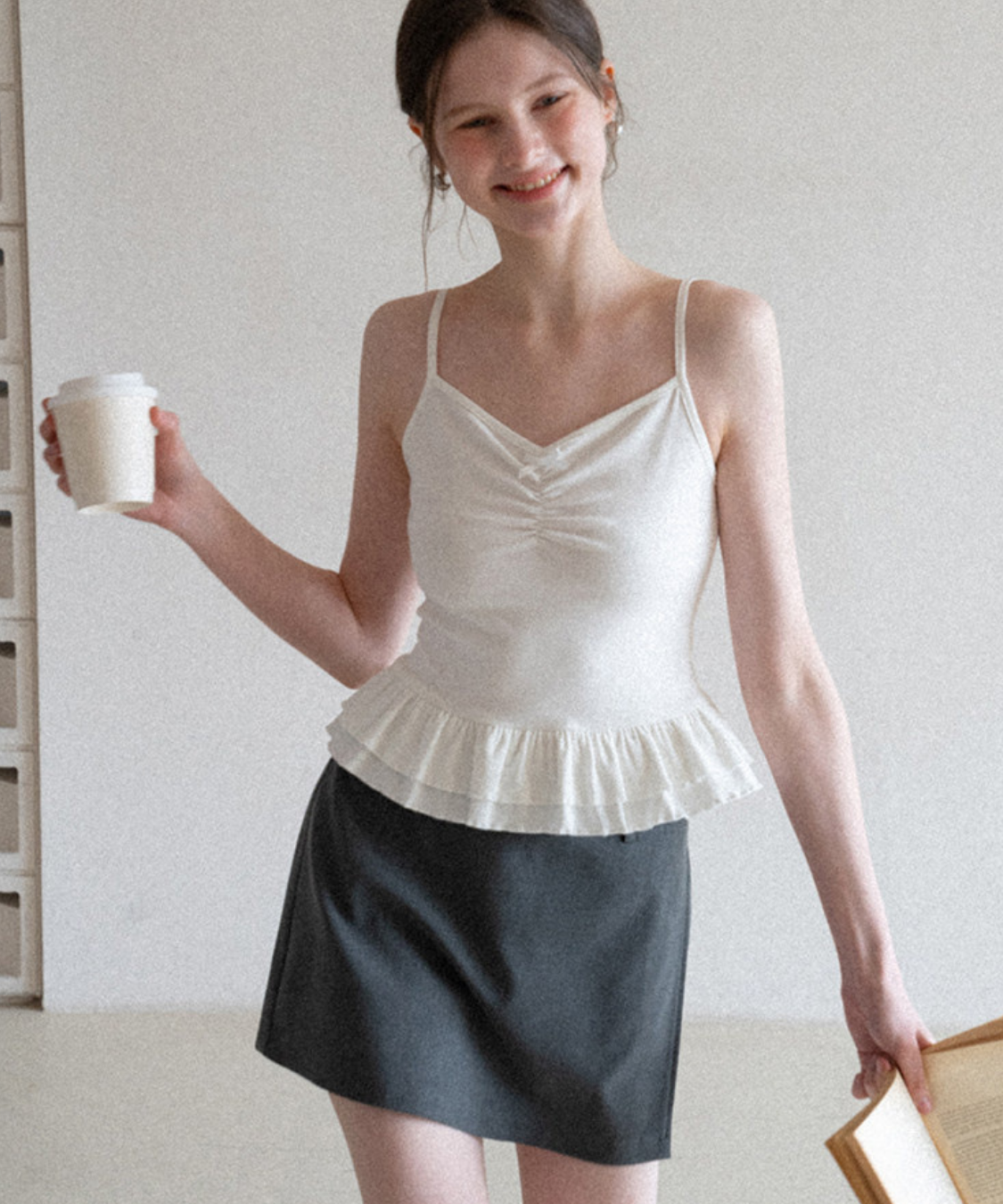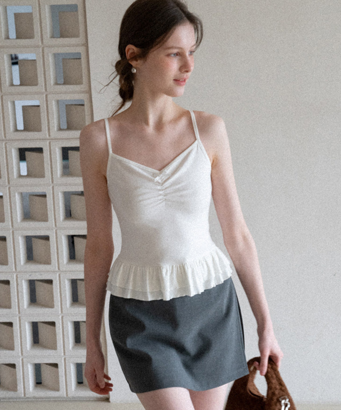 ウエストのシャーリングとペプラムフリルが愛らしい、華奢見えキャミソールです。