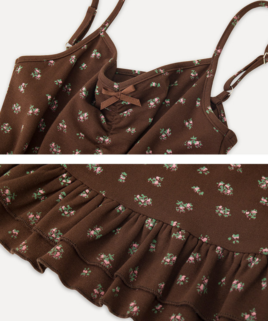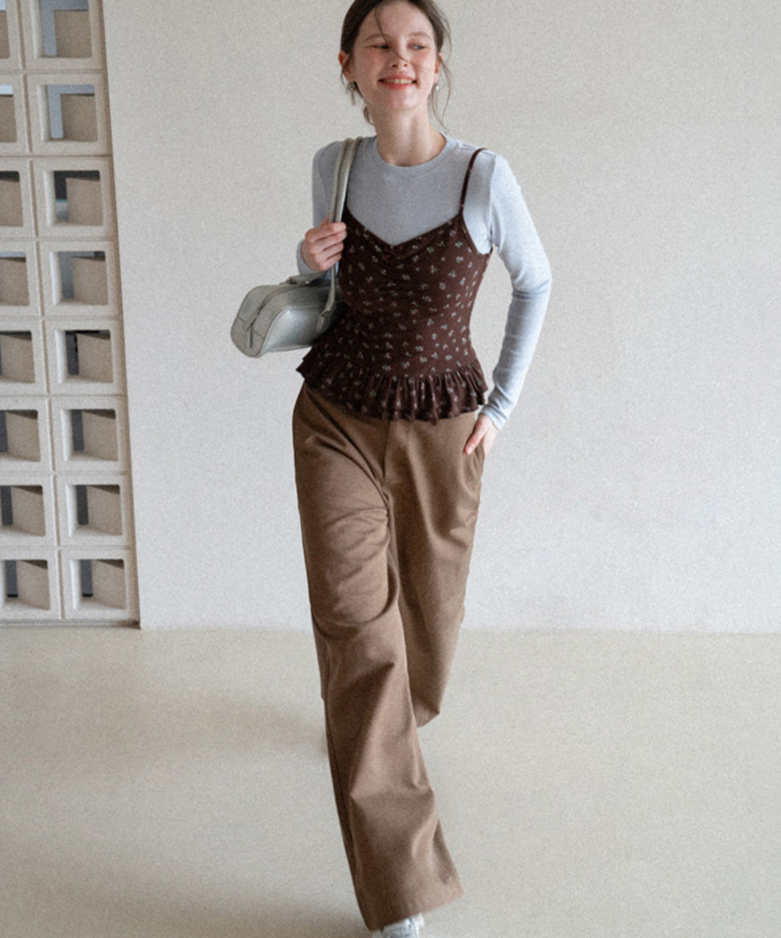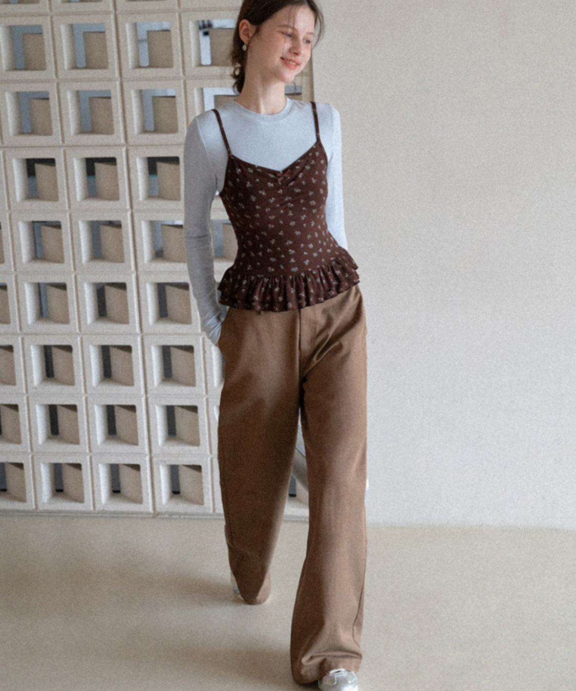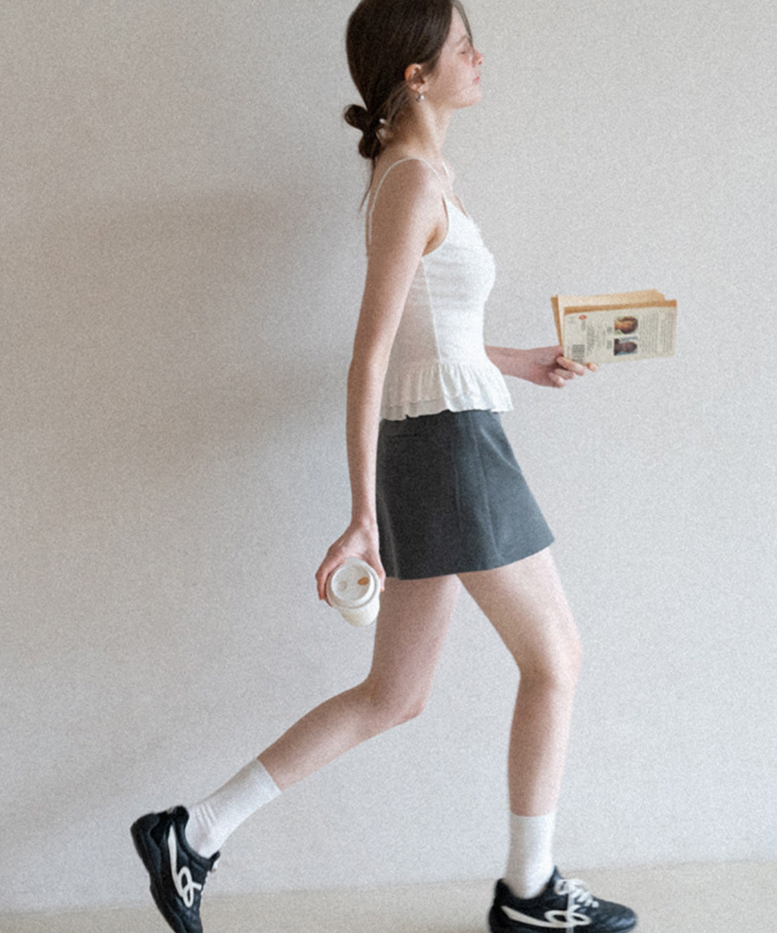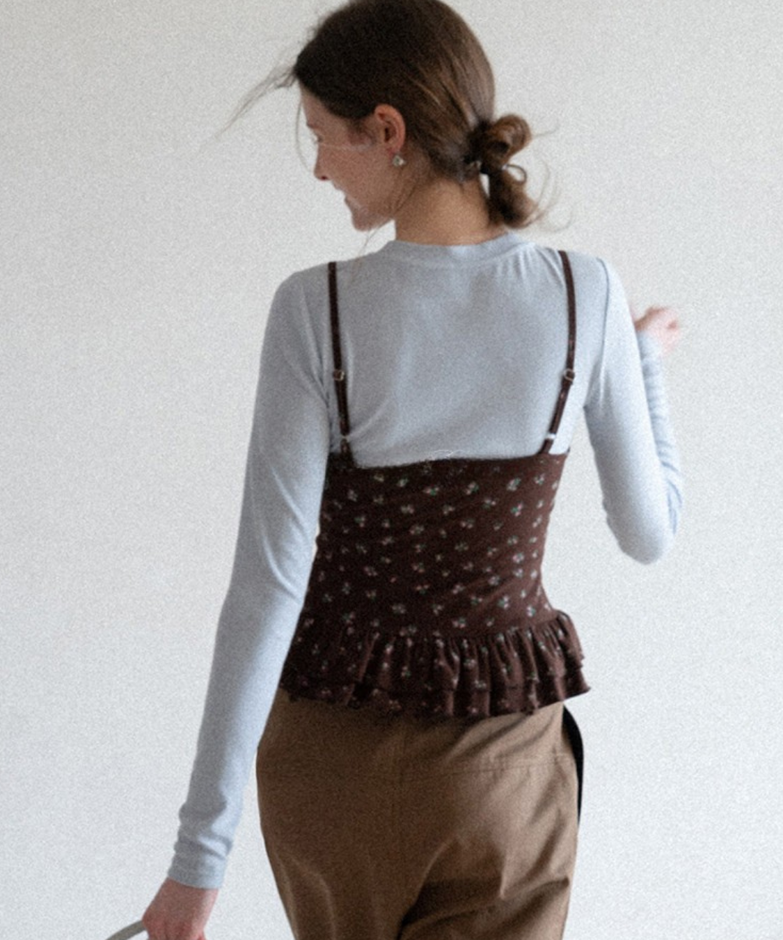 ウエストのシャーリングとペプラムフリルが愛らしい、華奢見えキャミソールです。