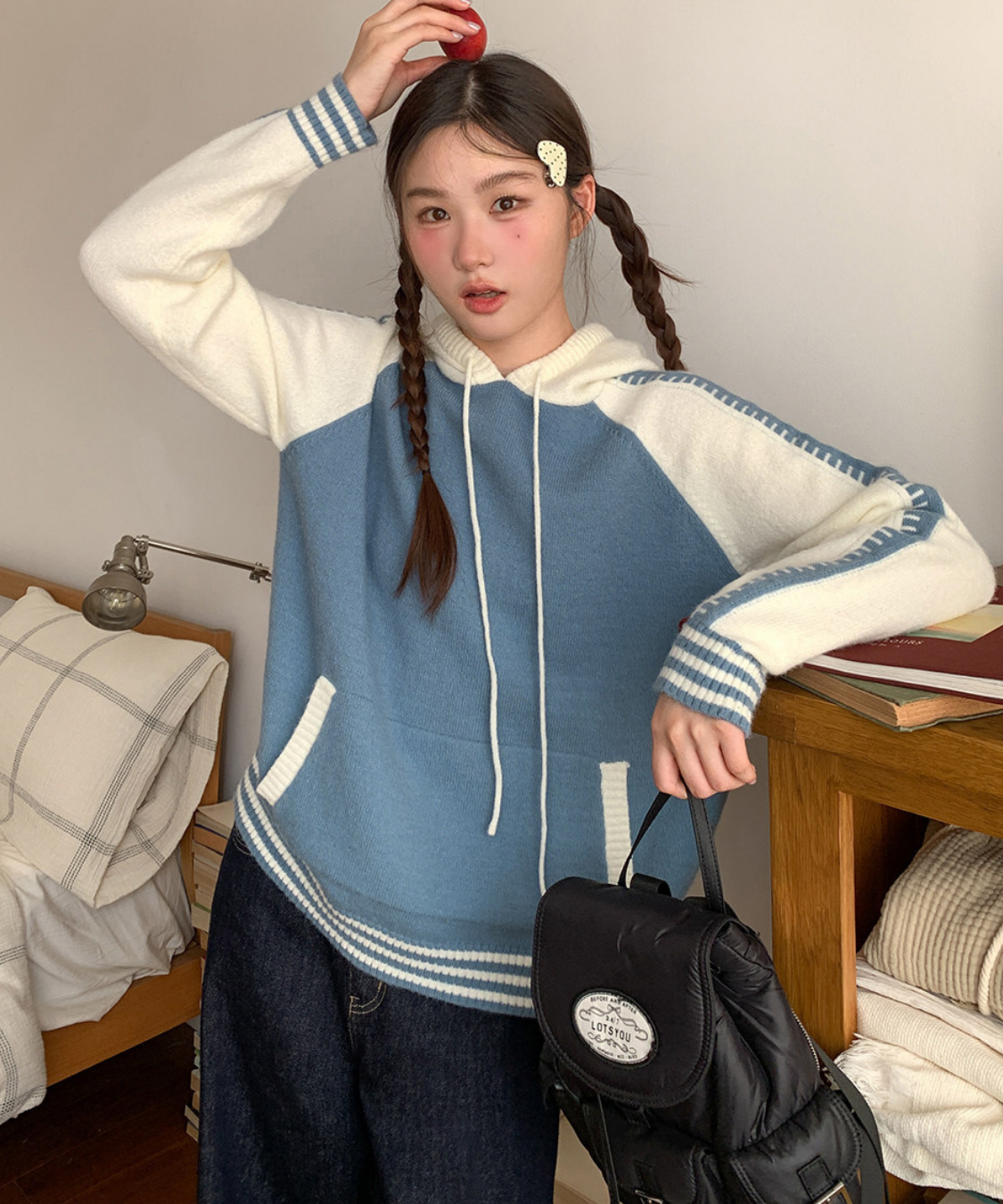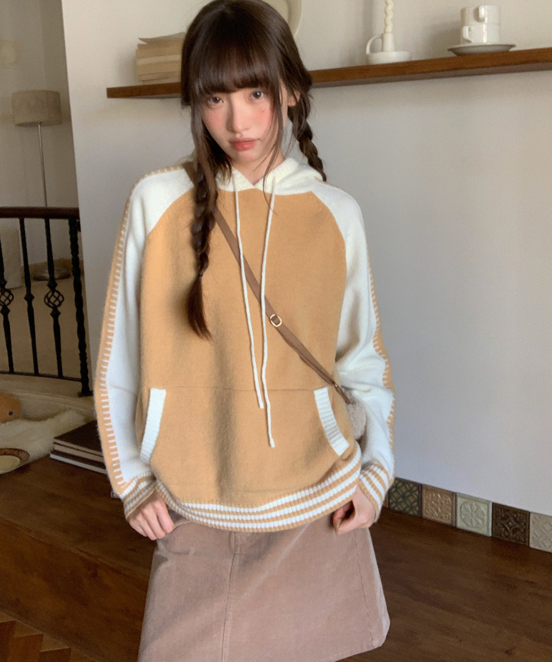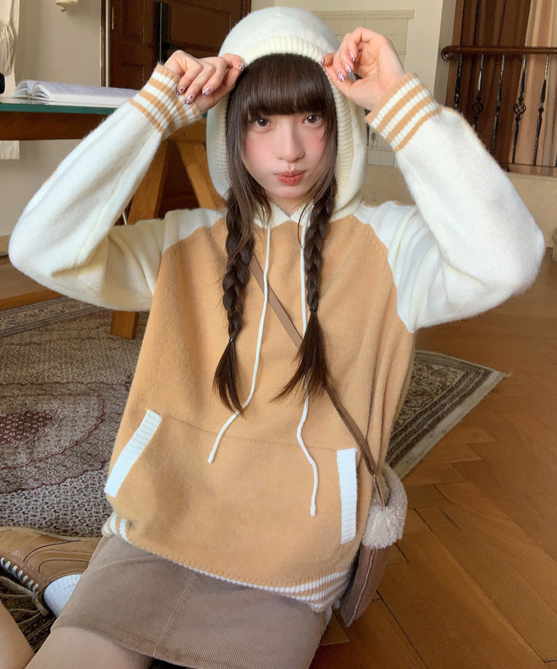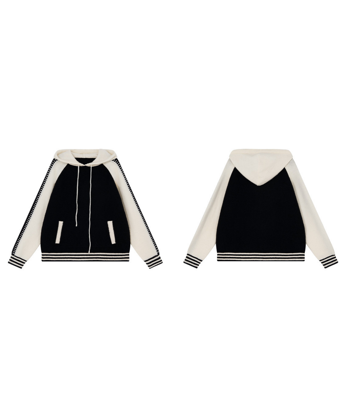 配色切り替えラグランニットフードパーカー