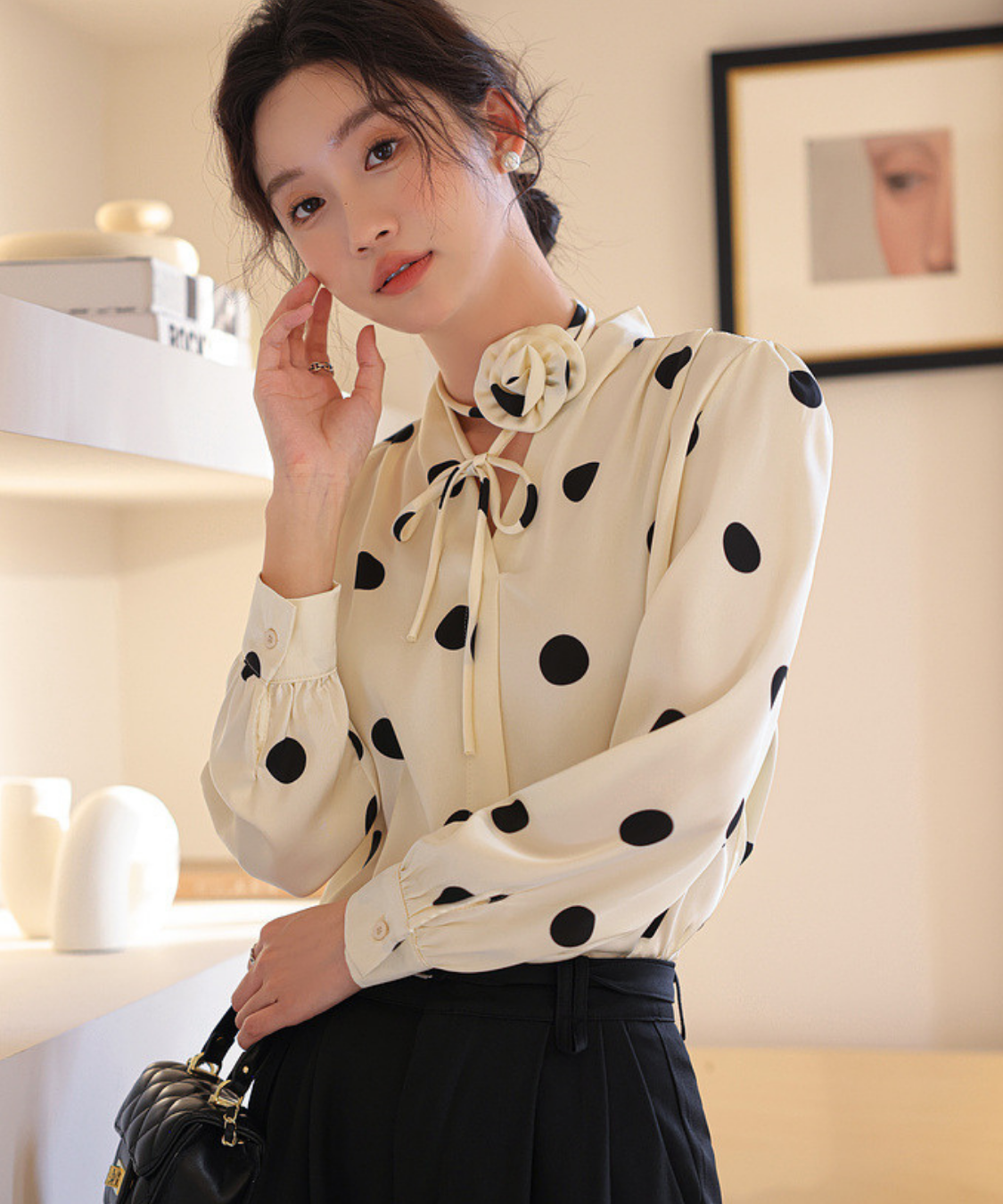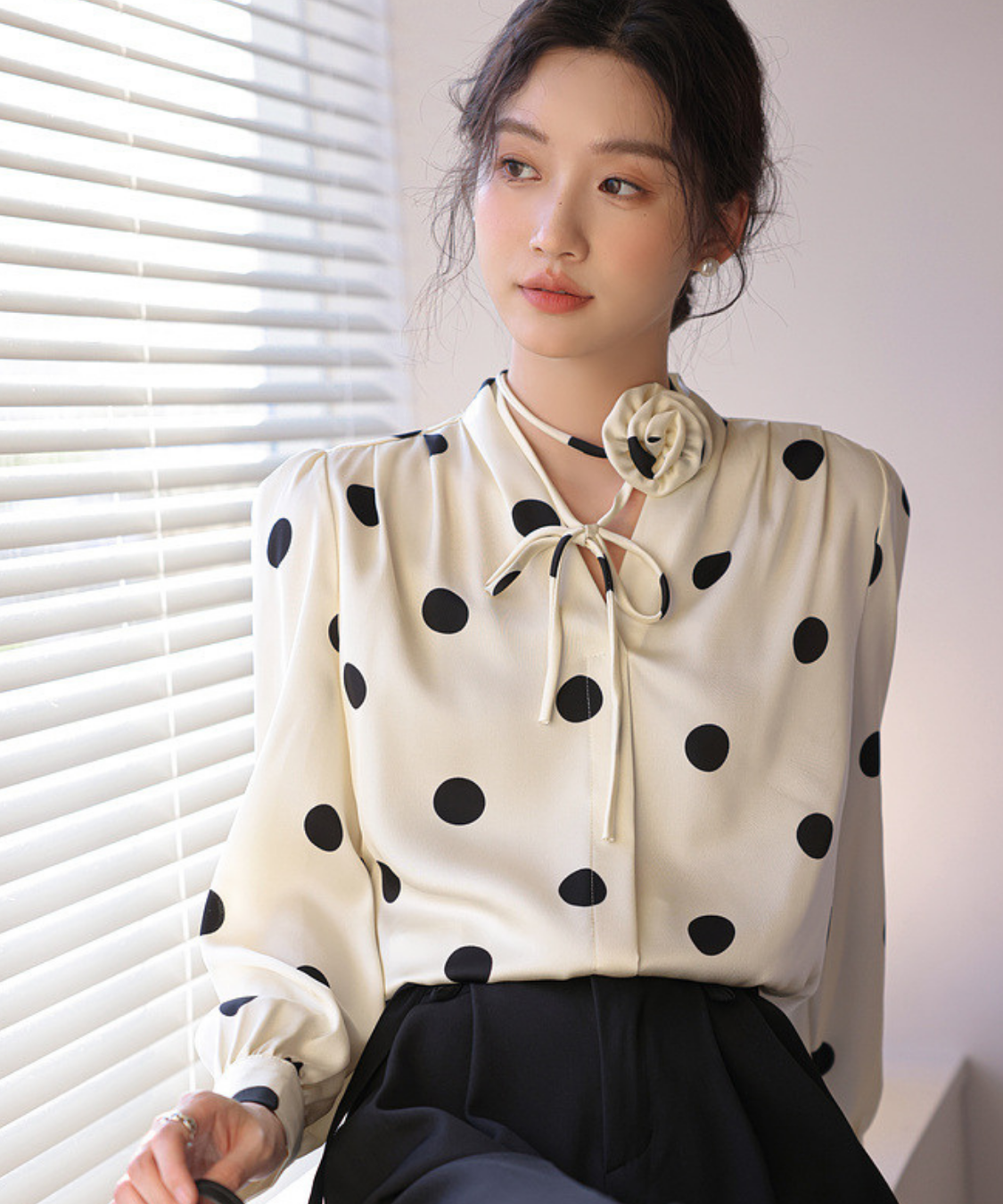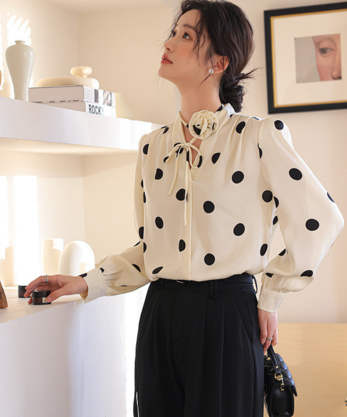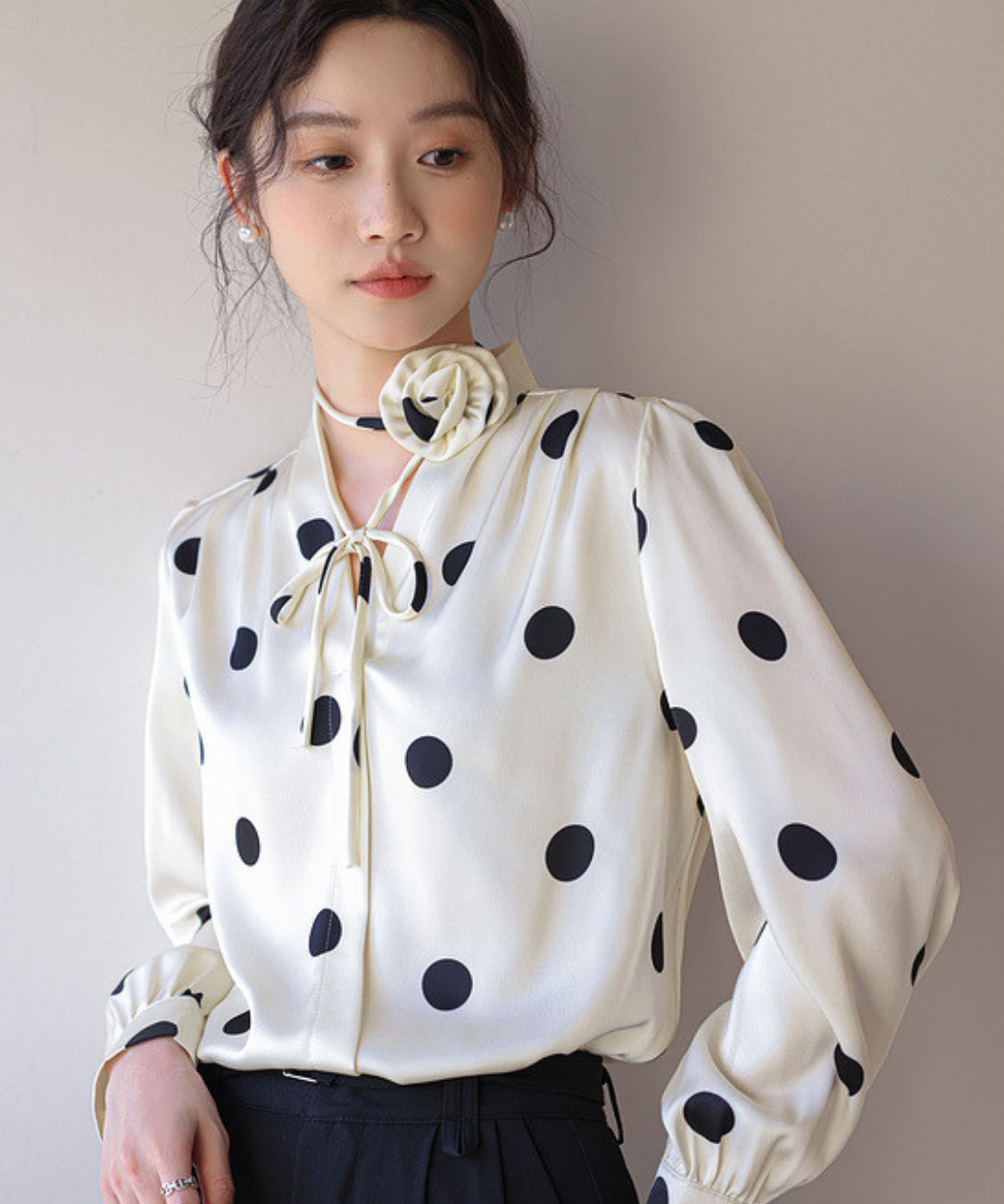 華やかなフラワーモチーフ付きリボンが目を引くドット柄ブラウスです。
