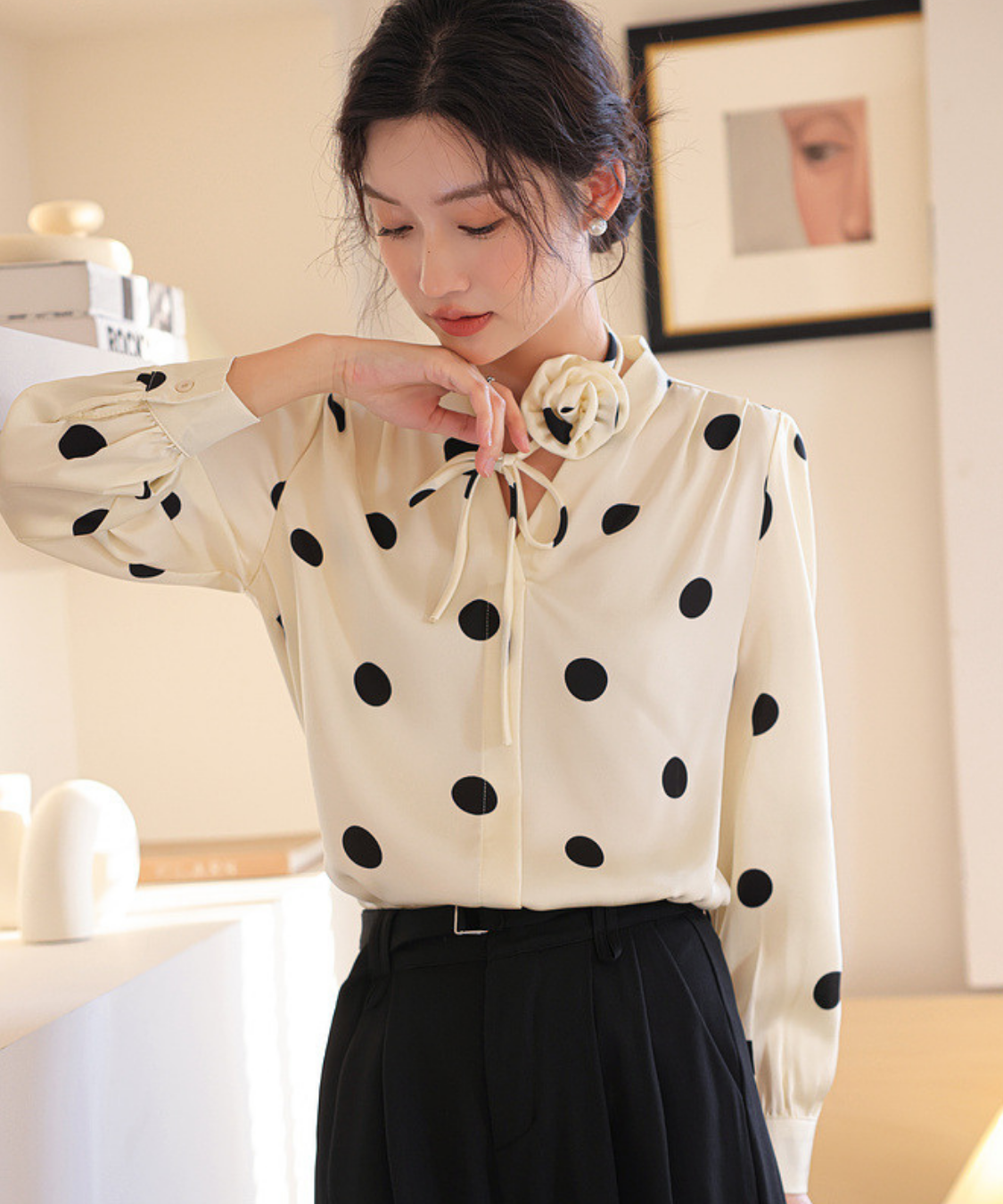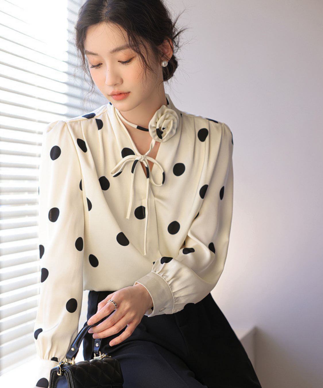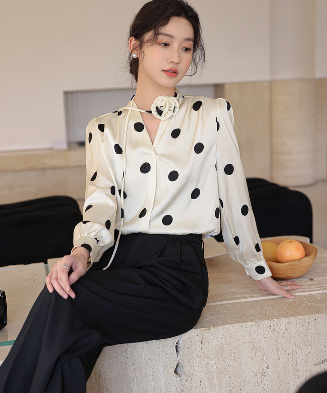 華やかなフラワーモチーフ付きリボンが目を引くドット柄ブラウスです。