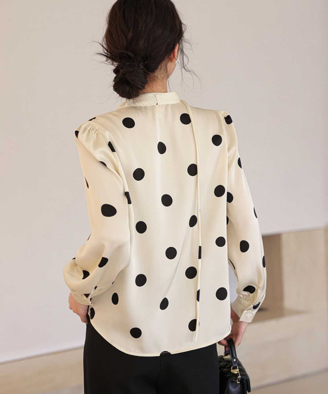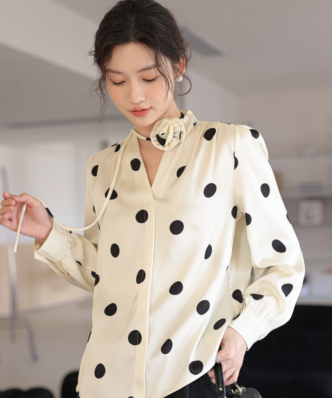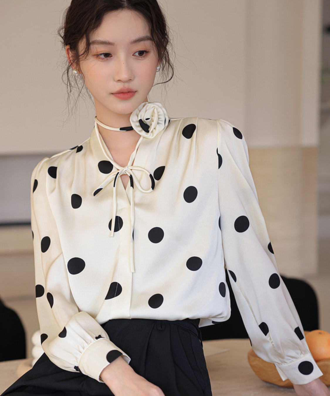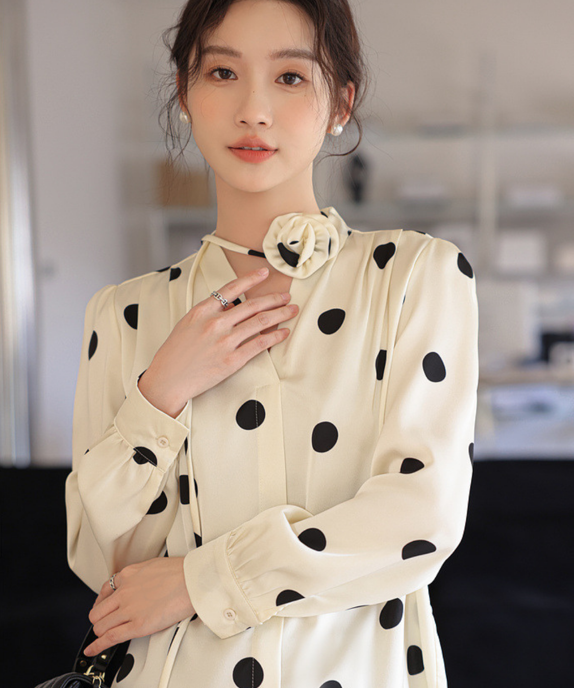 華やかなフラワーモチーフ付きリボンが目を引くドット柄ブラウスです。
