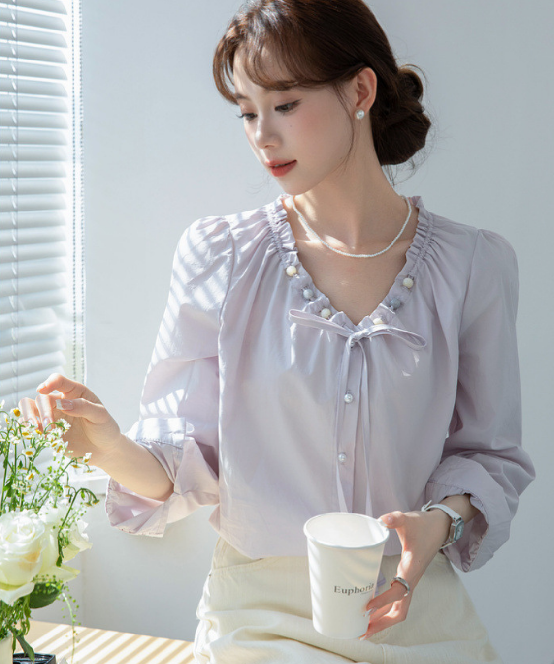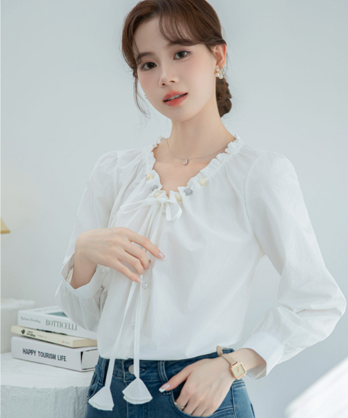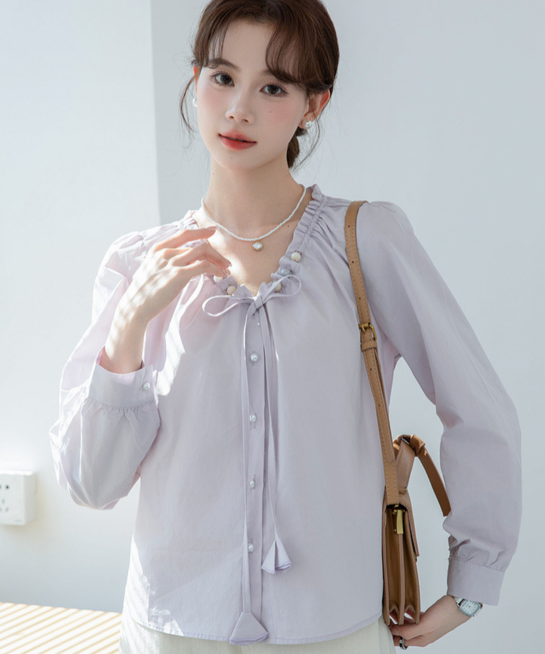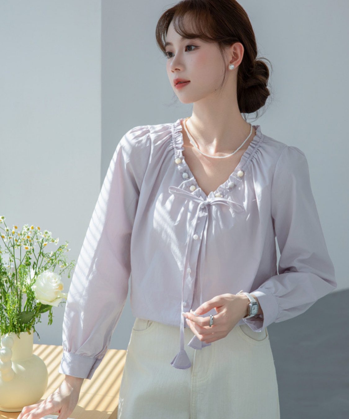 フリルとリボンが華やかなアクセントになったVネックブラウスです。