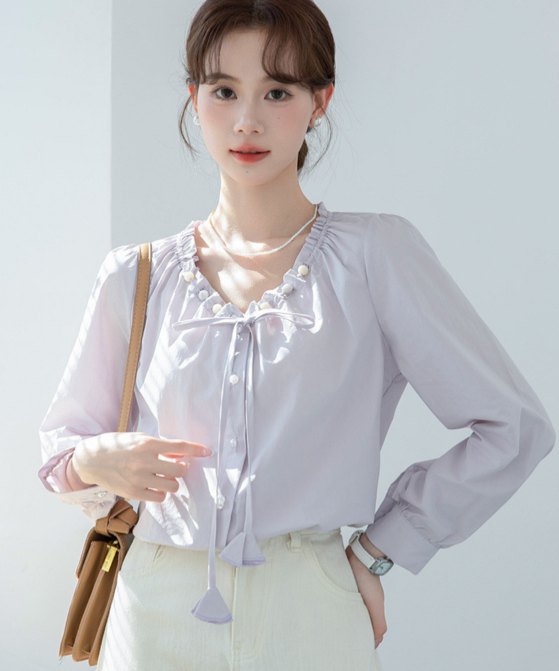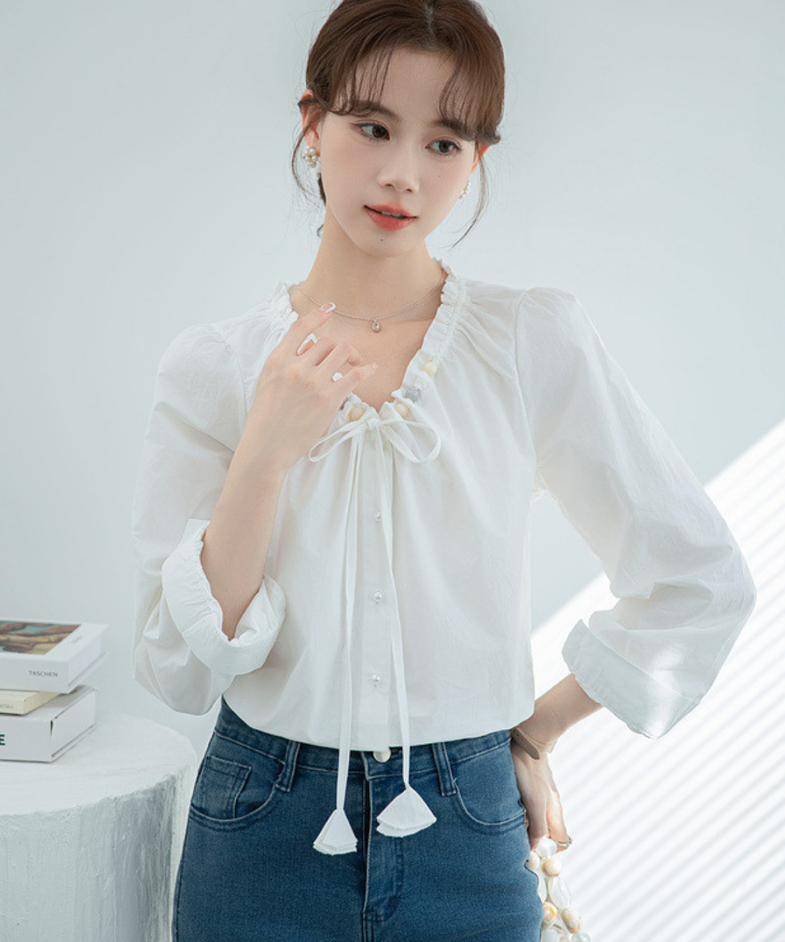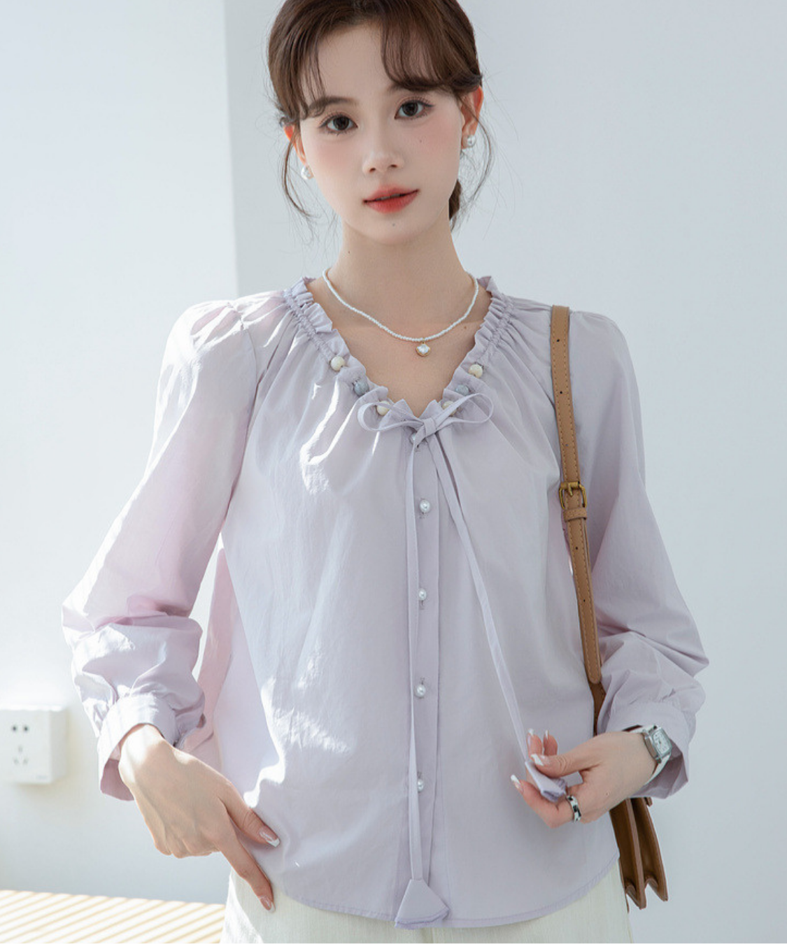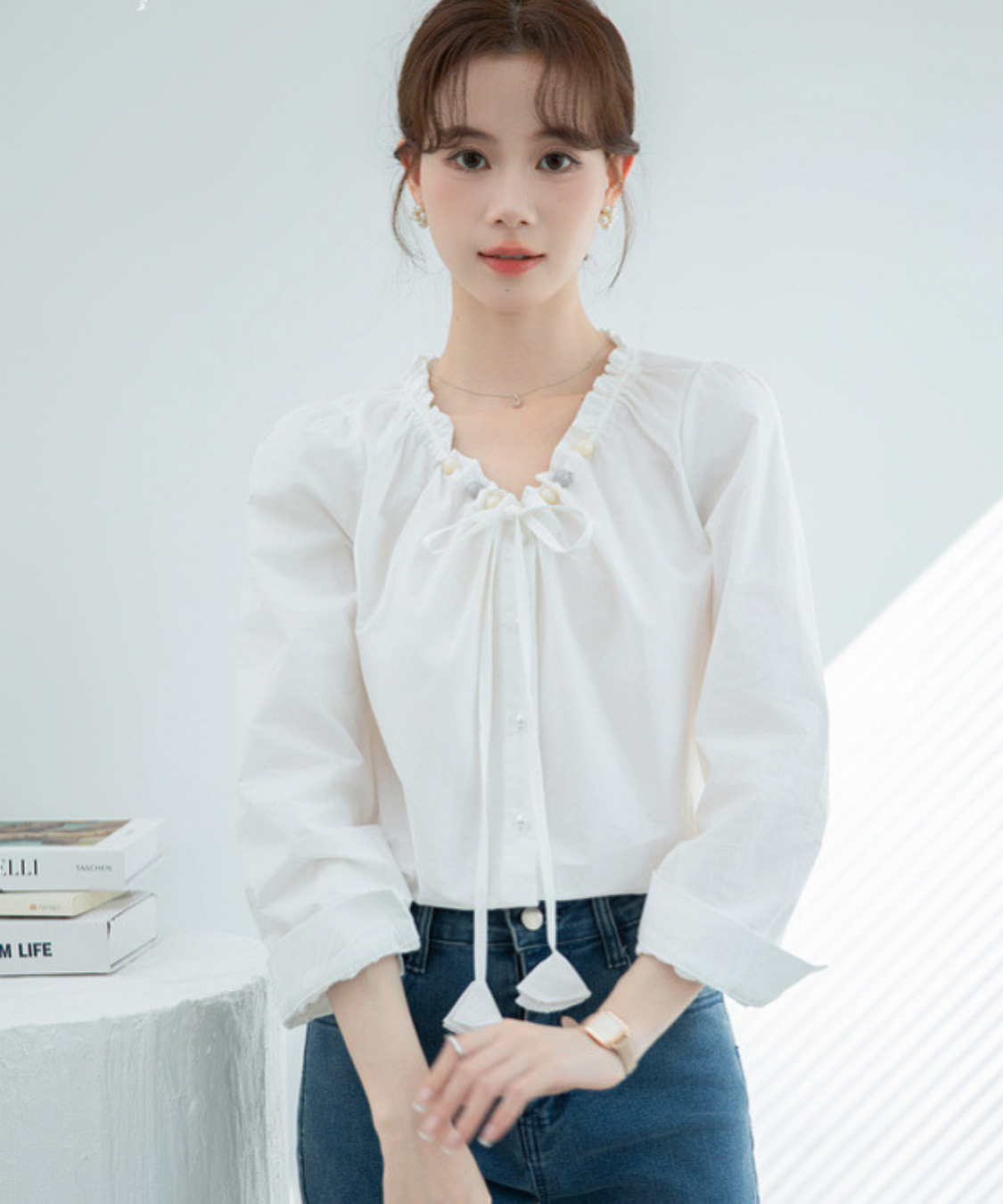 フリルとリボンが華やかなアクセントになったVネックブラウスです。