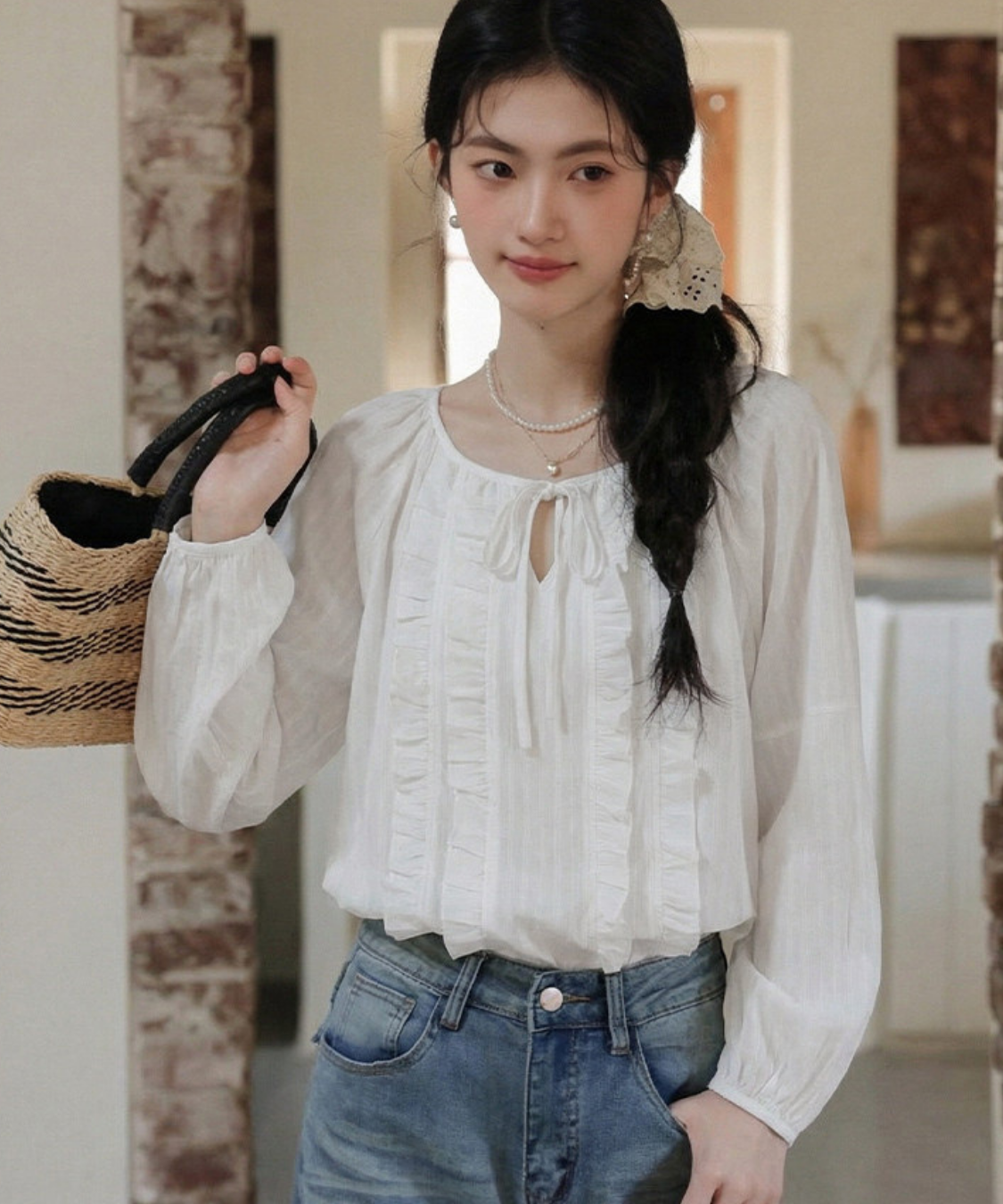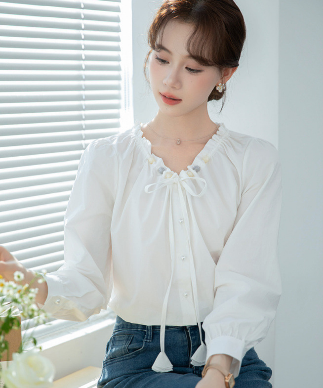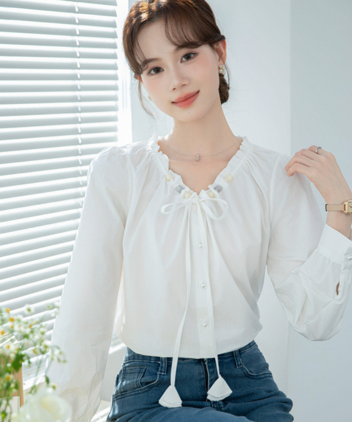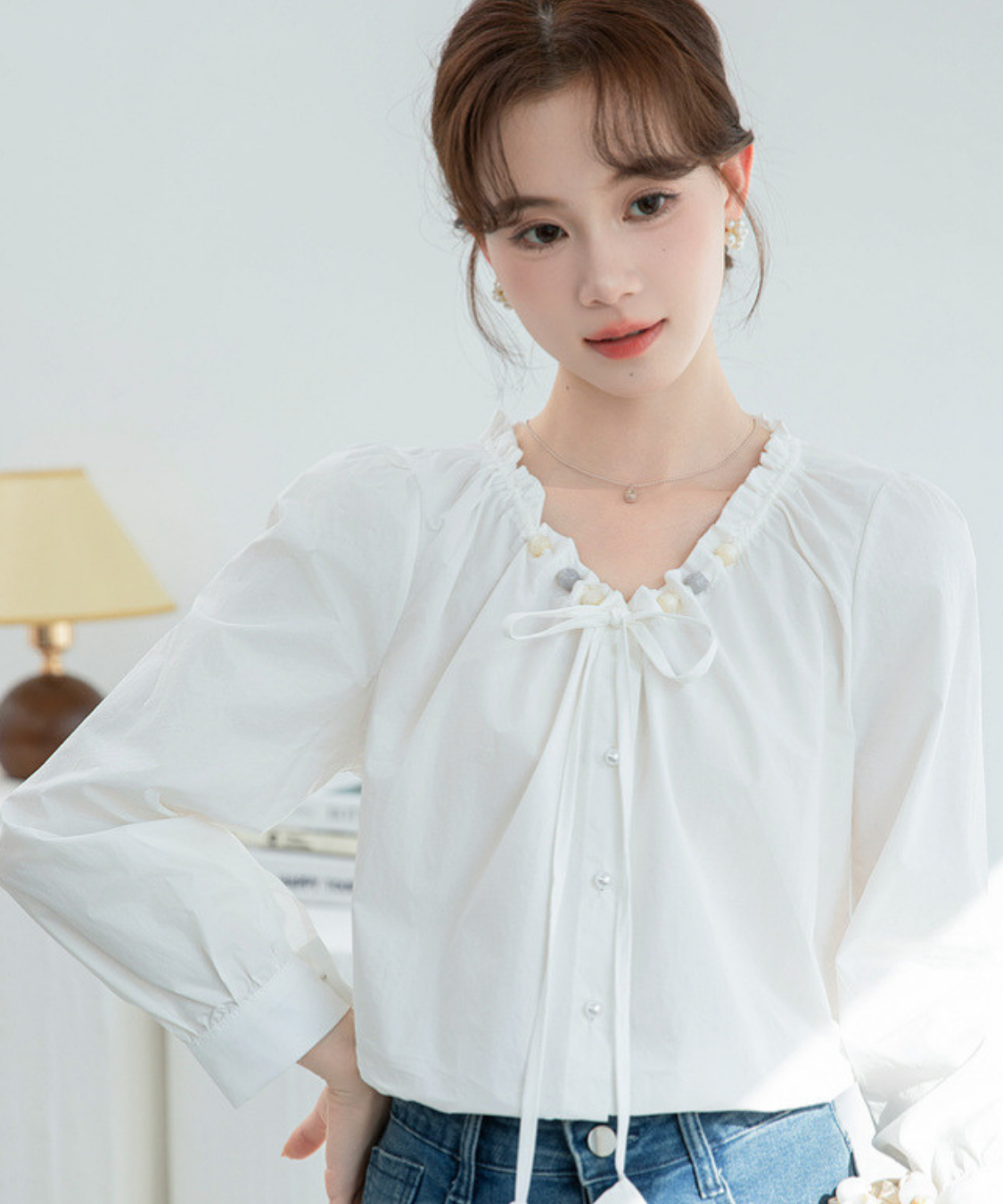 フリルとリボンが華やかなアクセントになったVネックブラウスです。