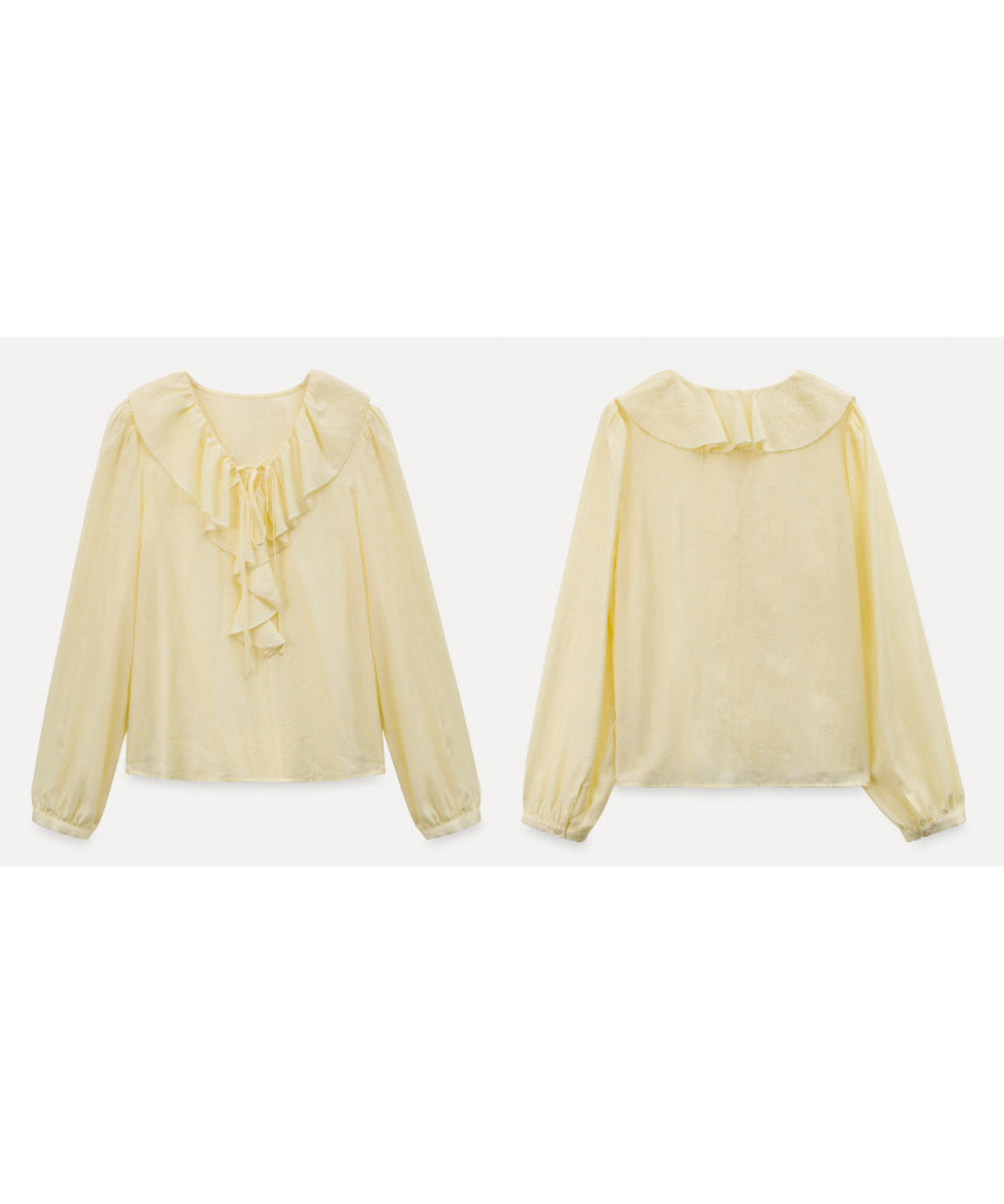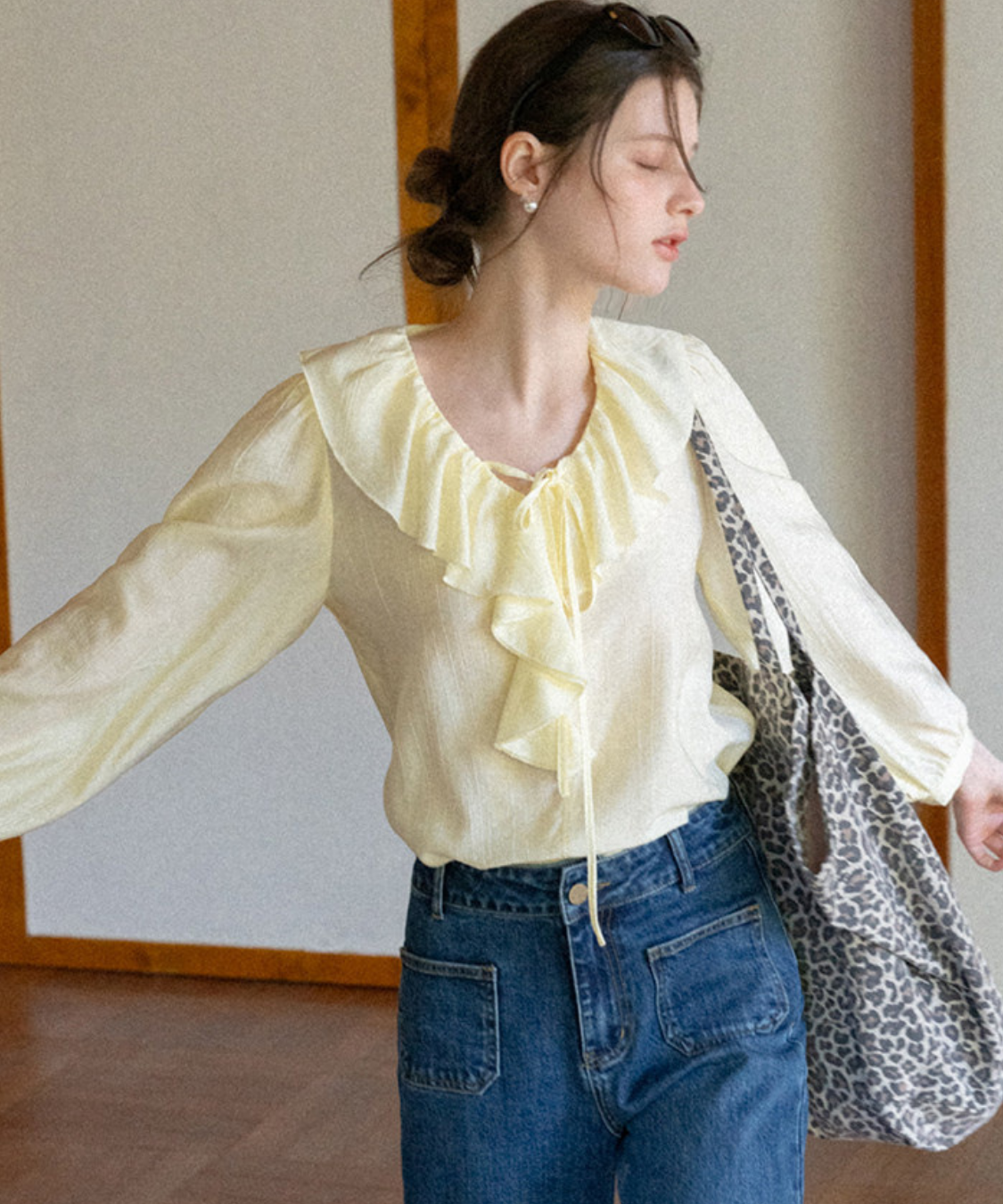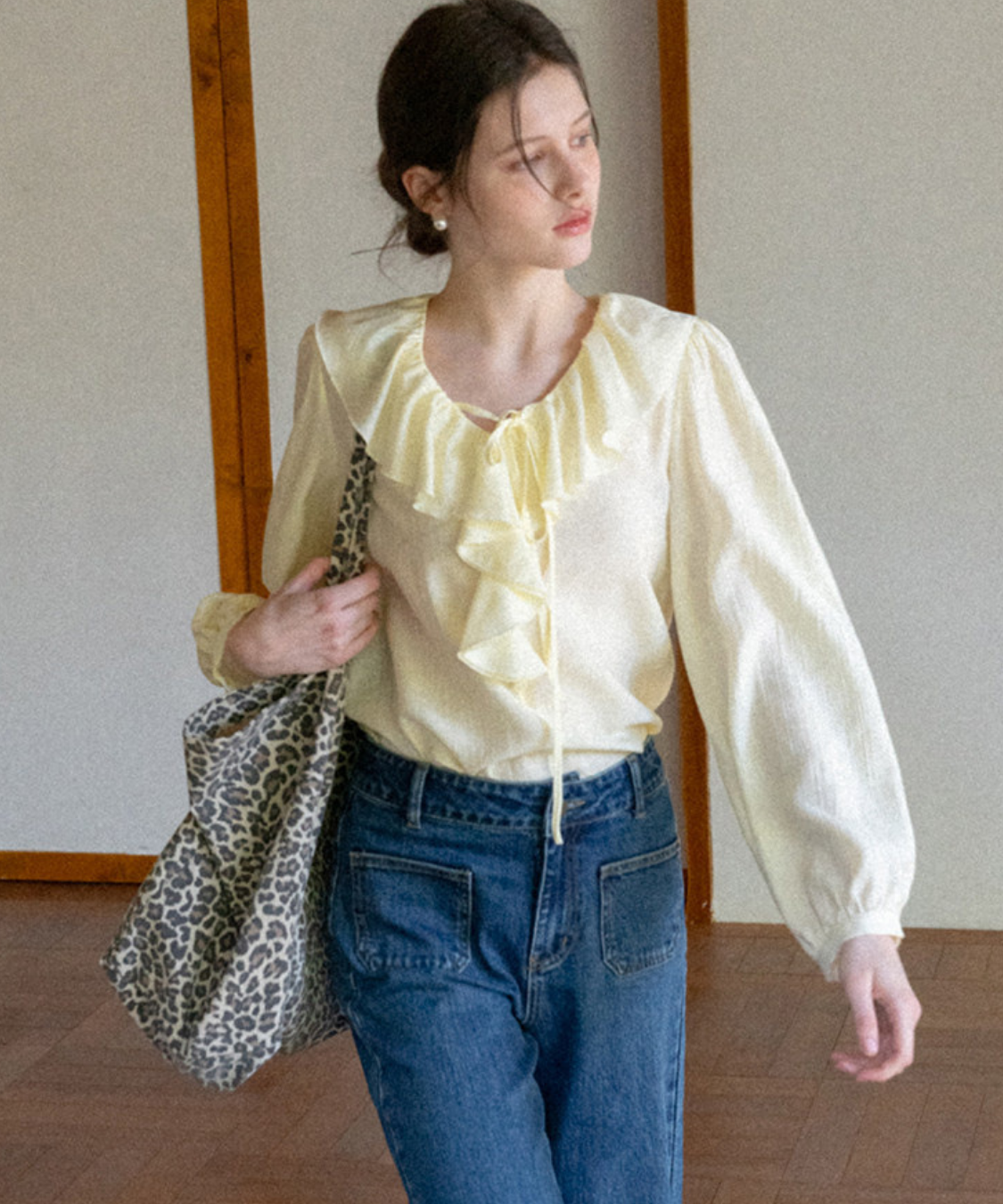 動くたびに揺れるフロントのフリルが華やかな印象のブラウスです。