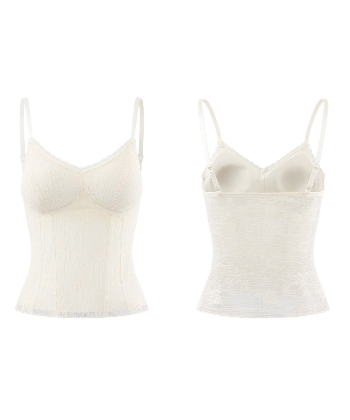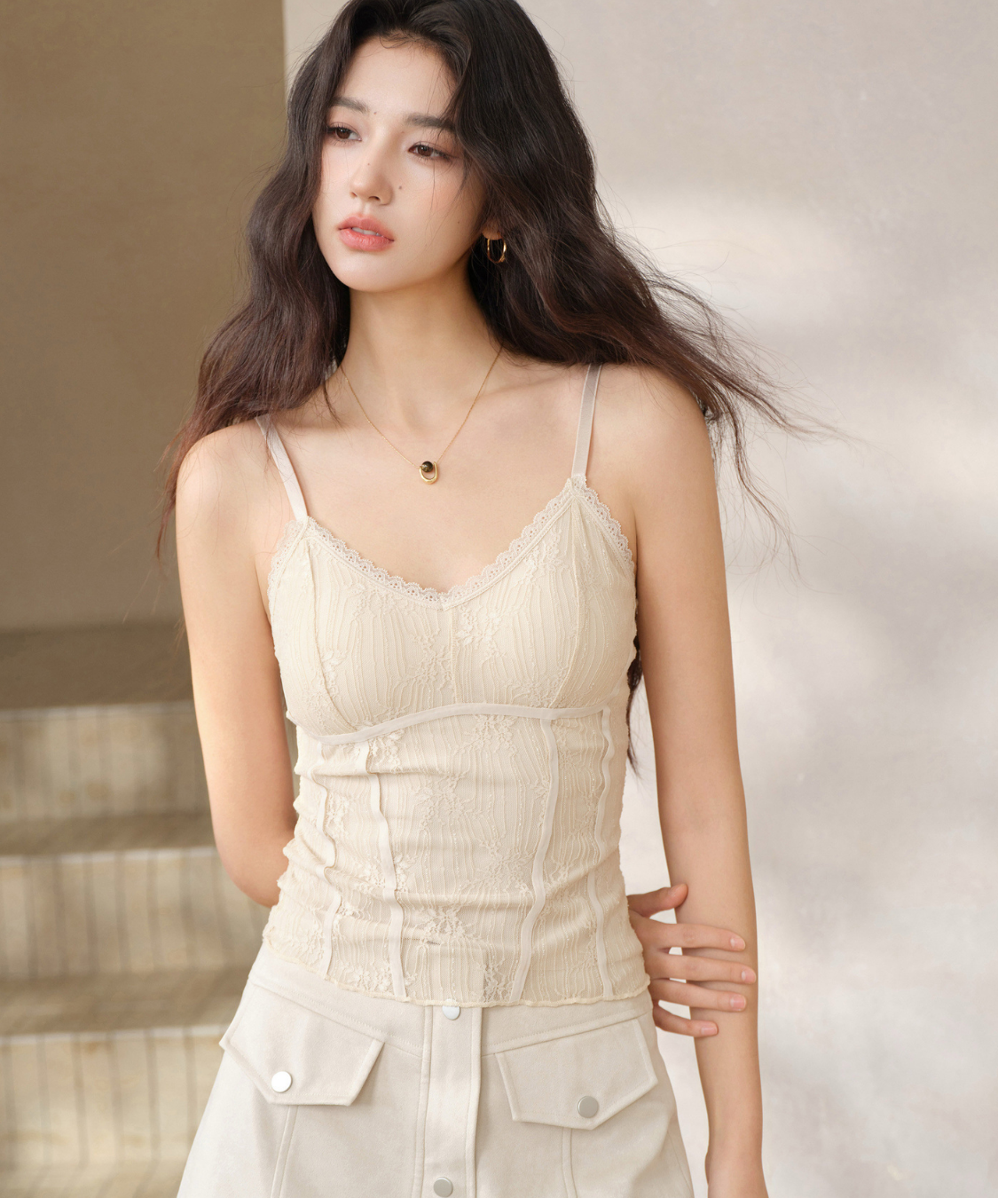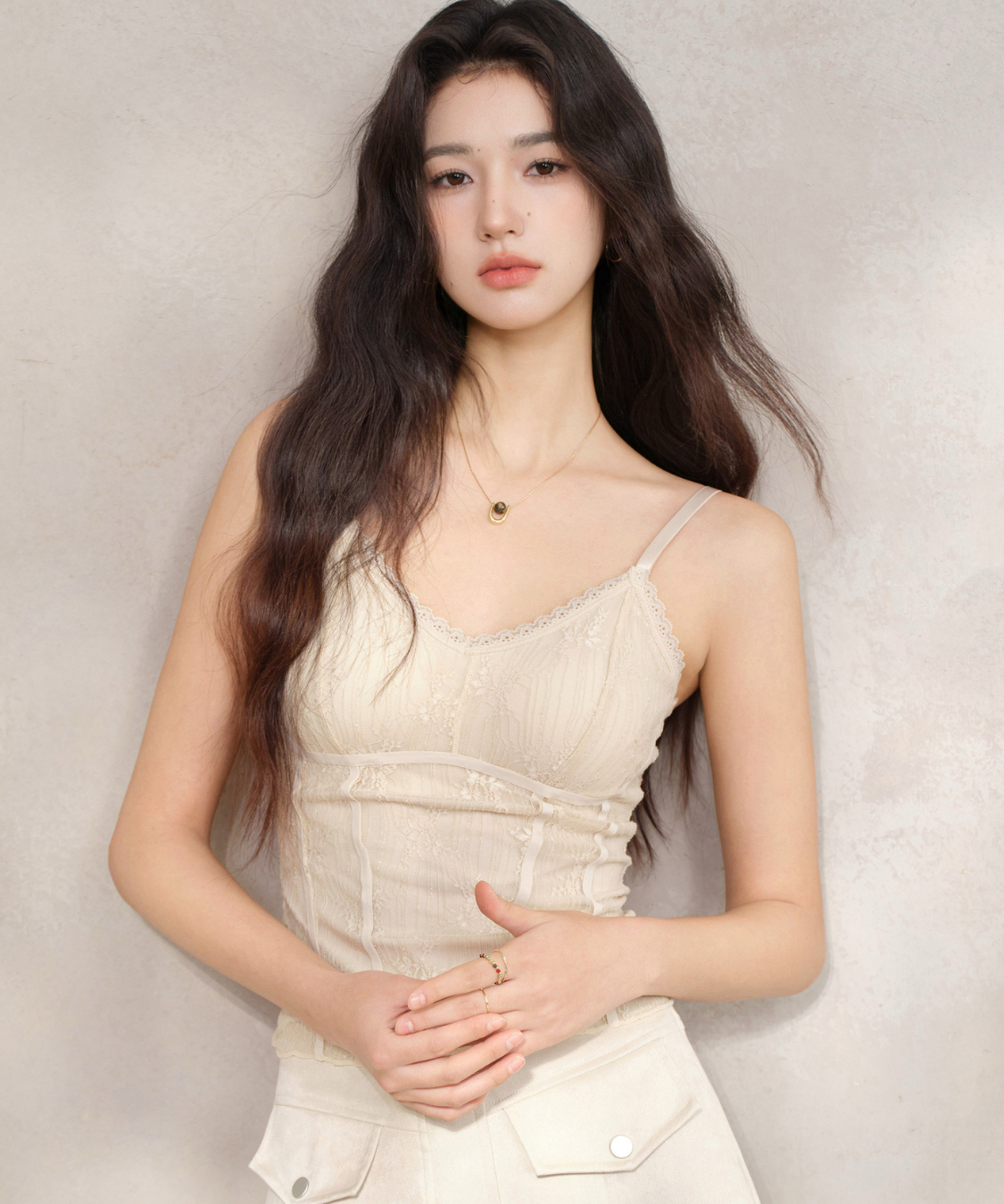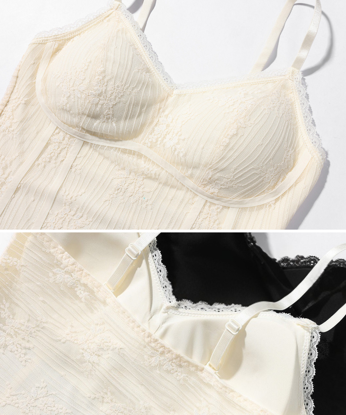 繊細なレースデザインが女性らしさを引き立てる、上品な印象のキャミソールです。