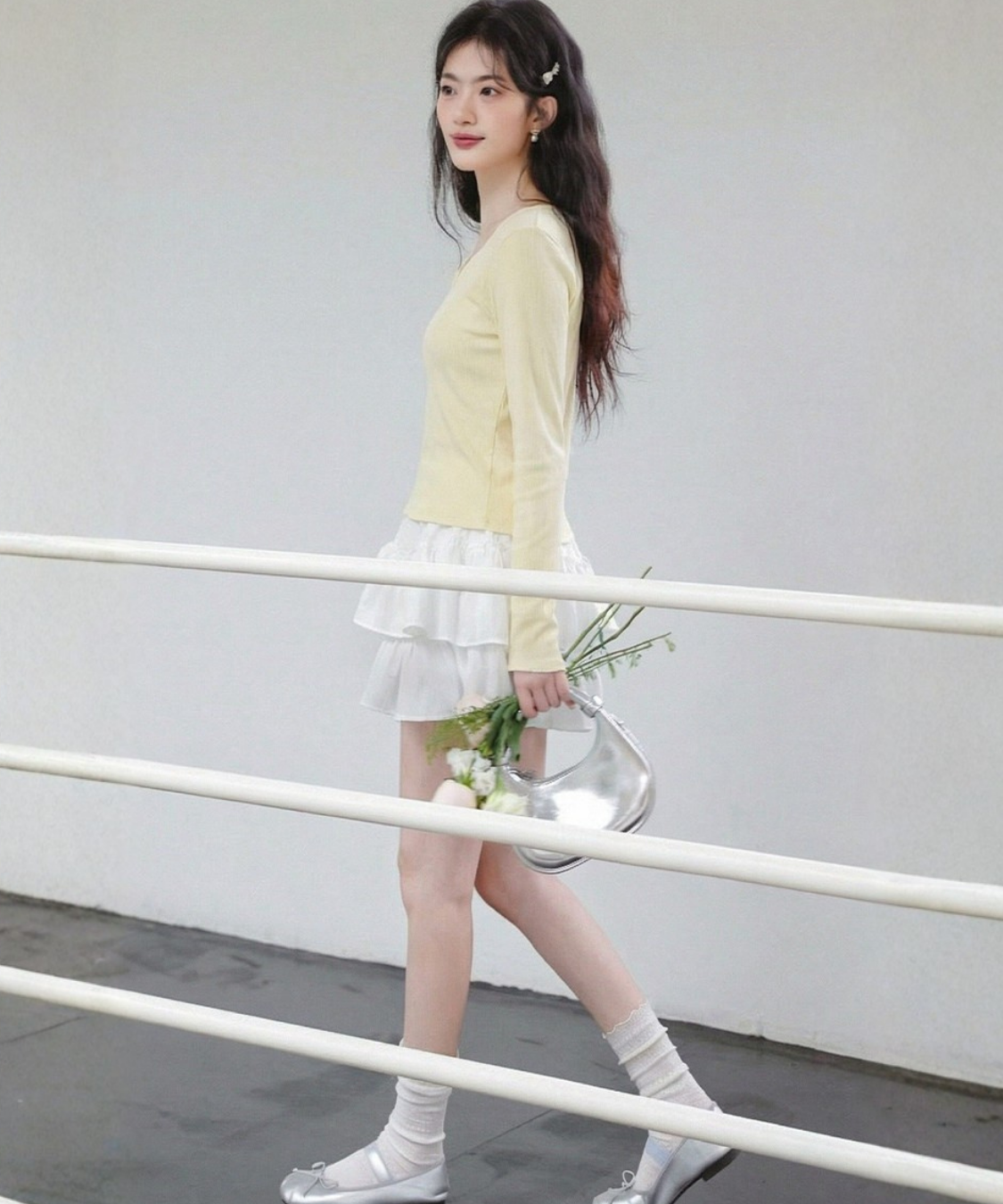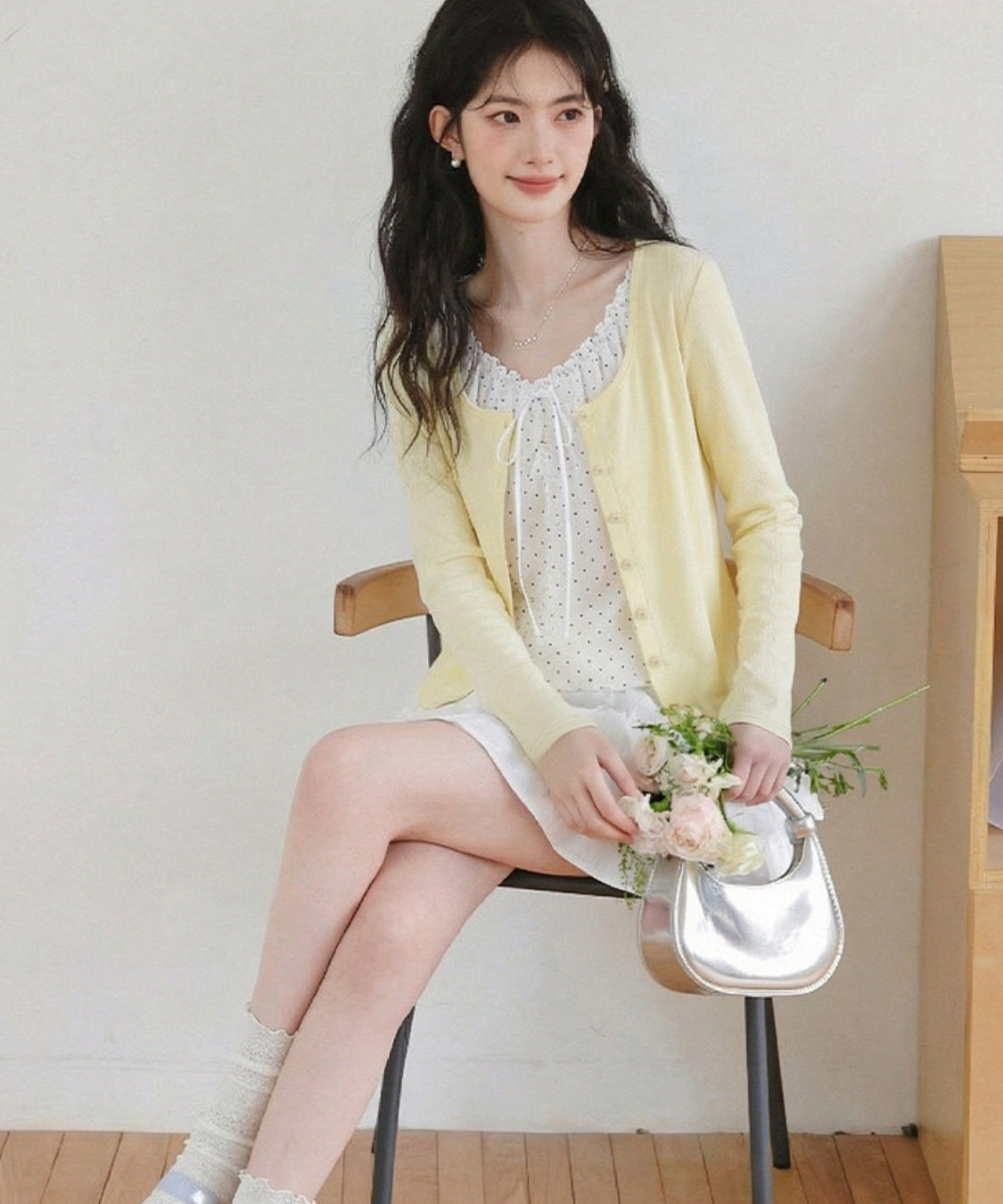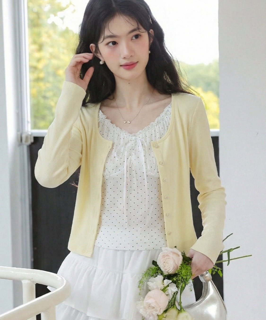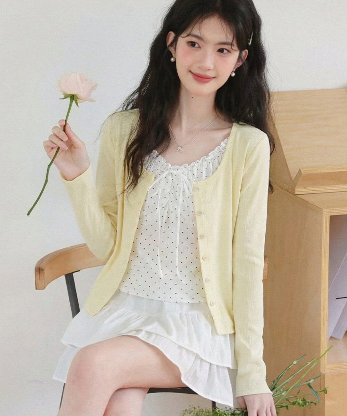 胸元のリボンとさりげないフリルがフェミニンな印象を引き立て、顔まわりを華やかに見せます♡
