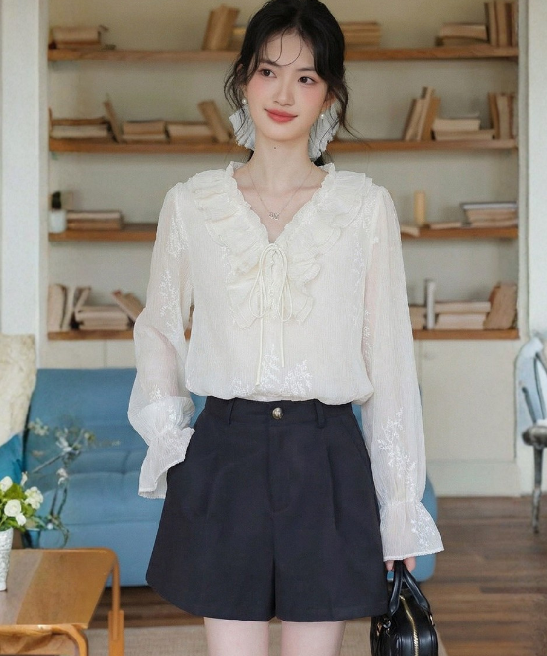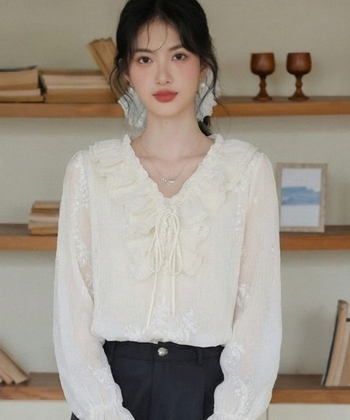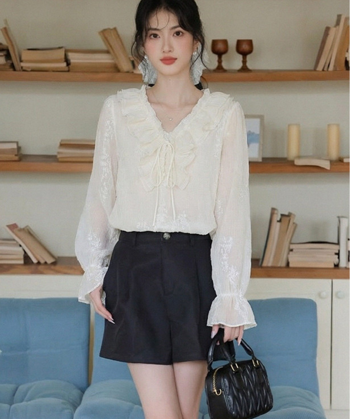 繊細なシアー素材にフリルを重ねた、ロマンティックムード漂うVネックブラウスです。