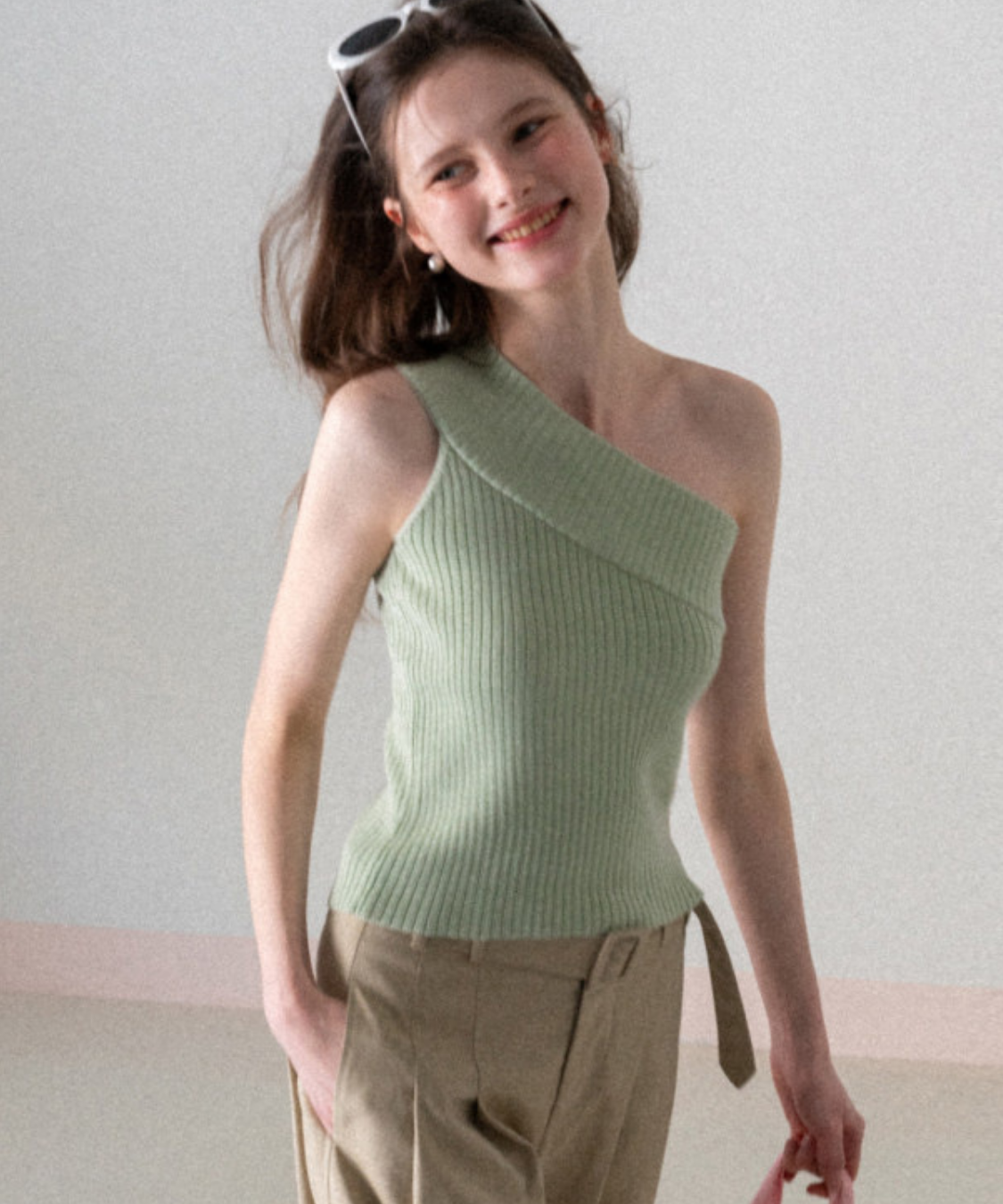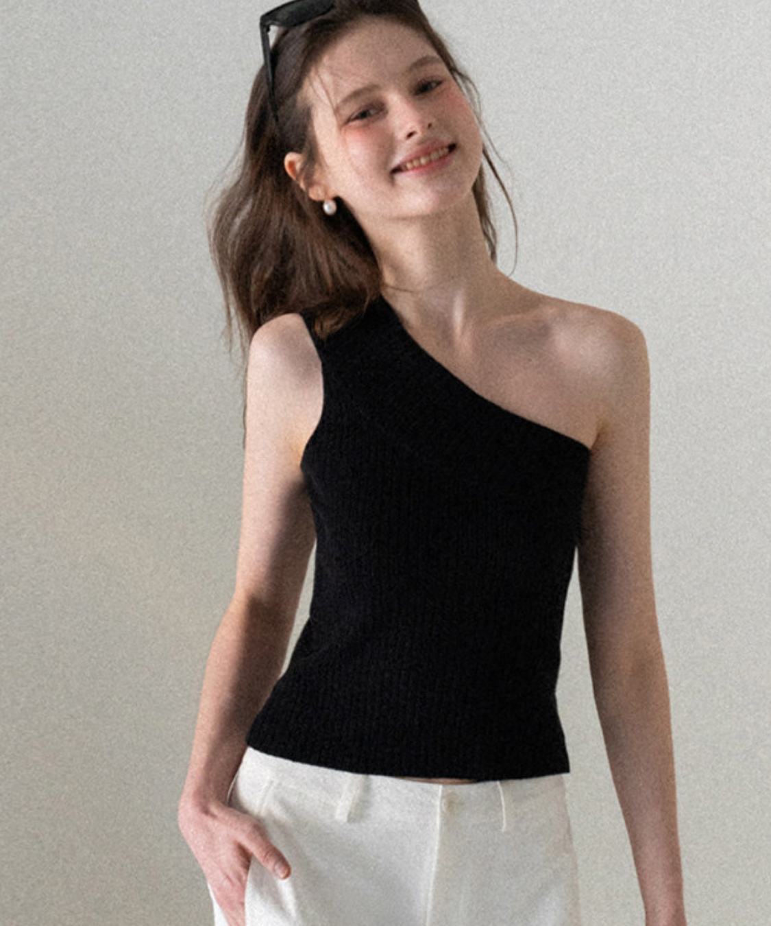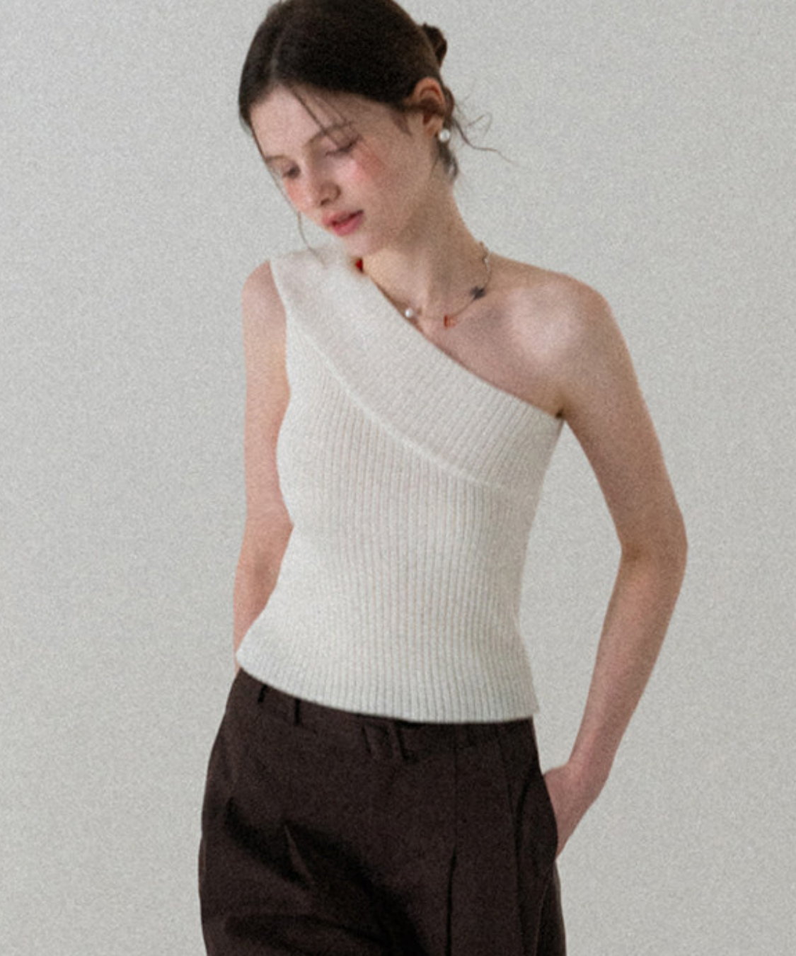 斜めに入ったアシンメトリーデザインが目を惹くワンショルダーリブトップスです。