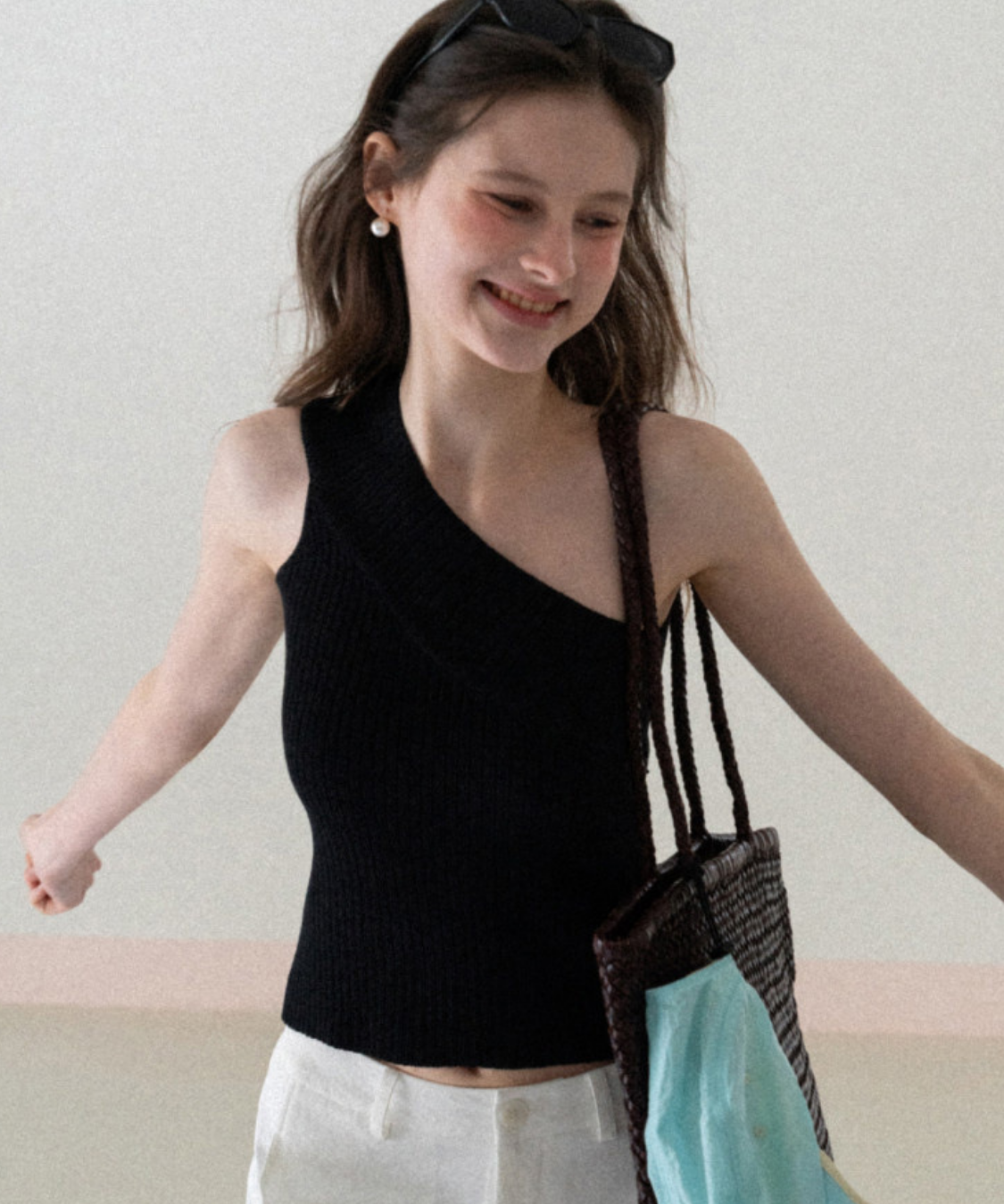 アシンメトリーワンショルダーリブトップス