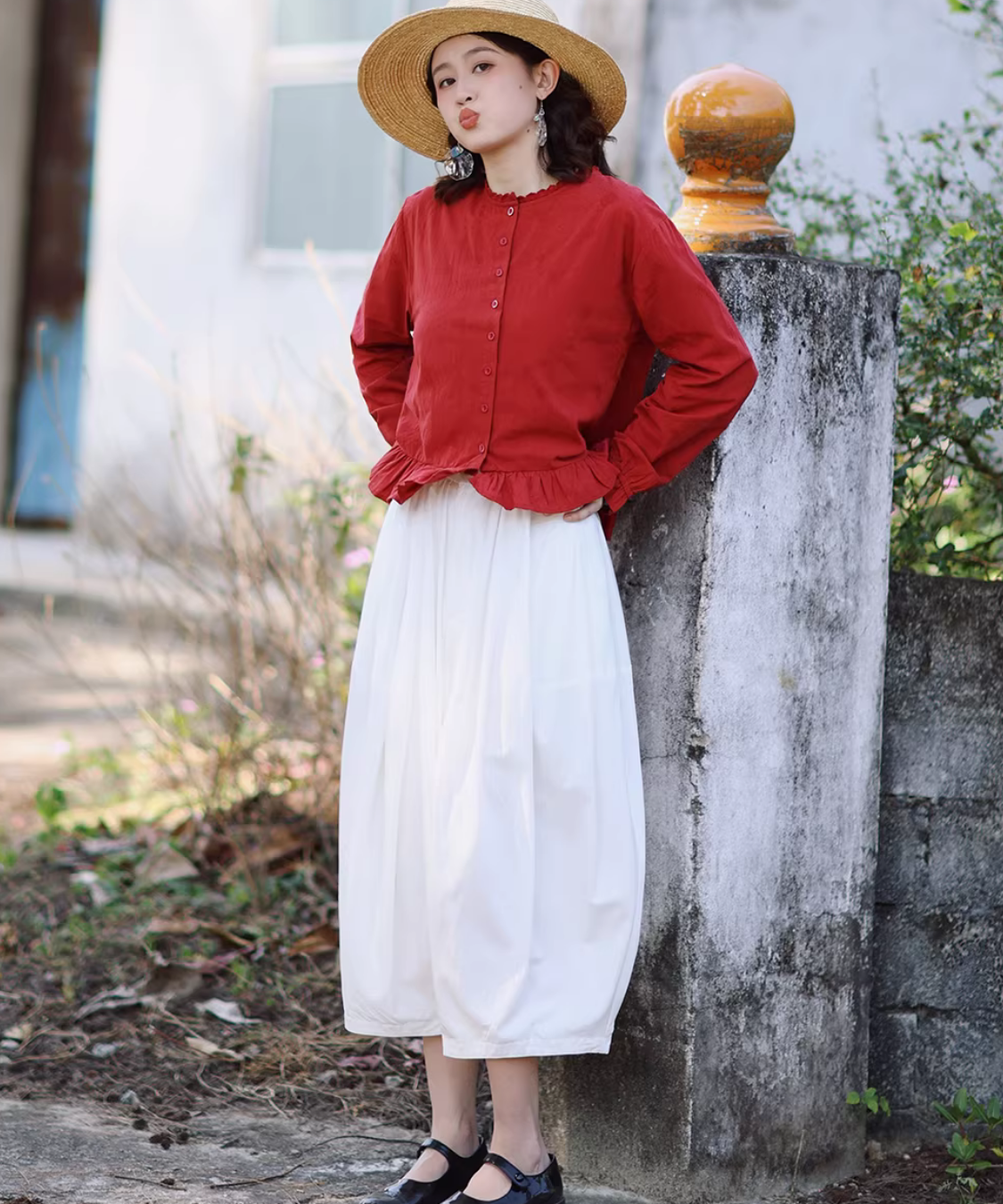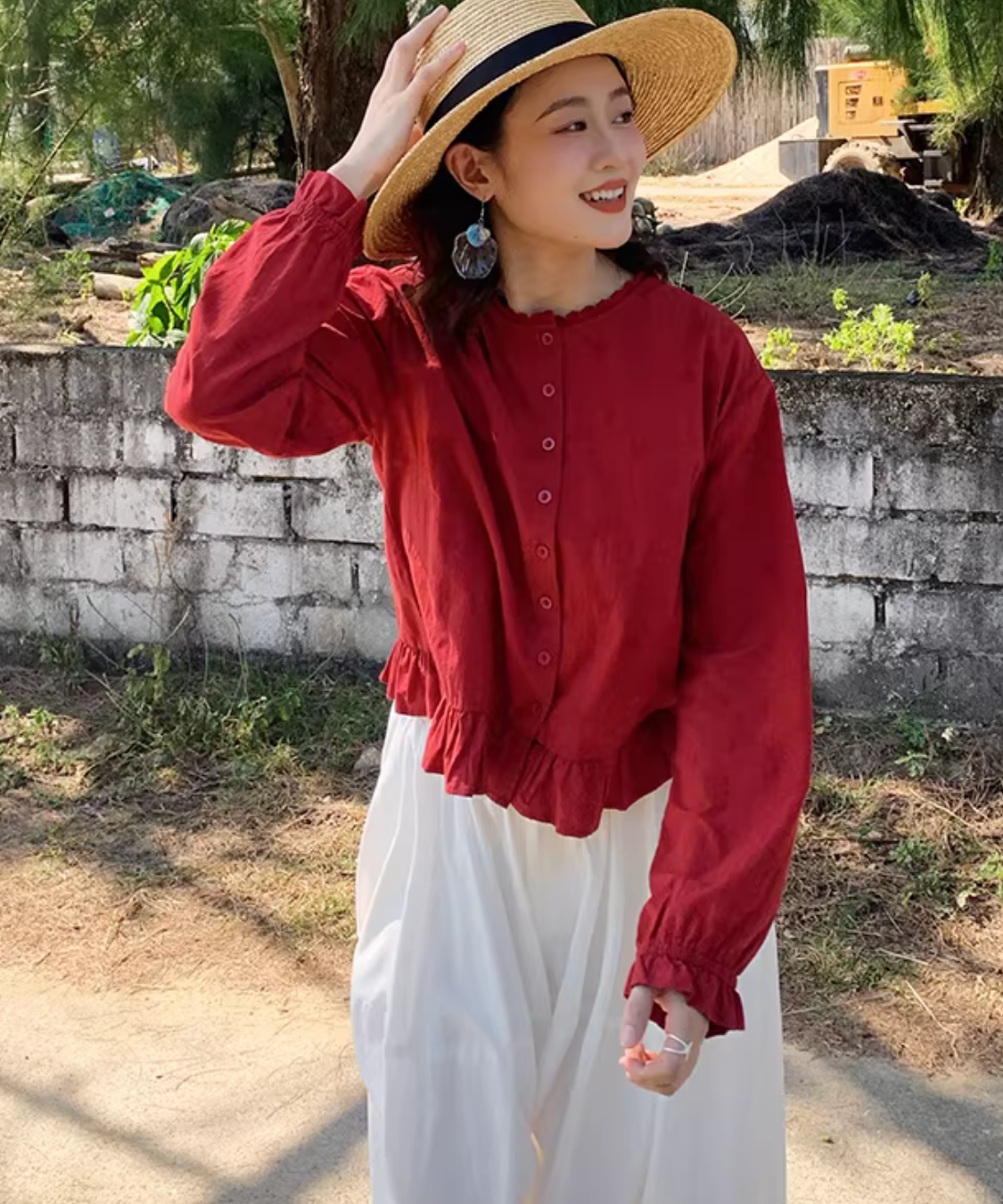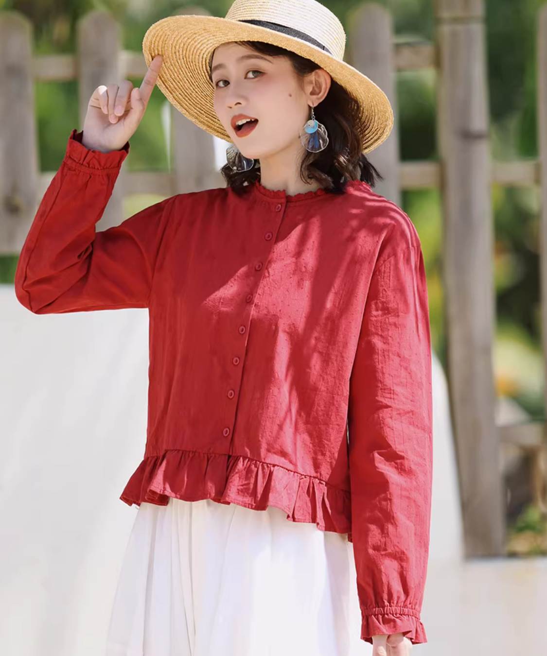 ノーカラーフロントボタン裾フリルブラウス
