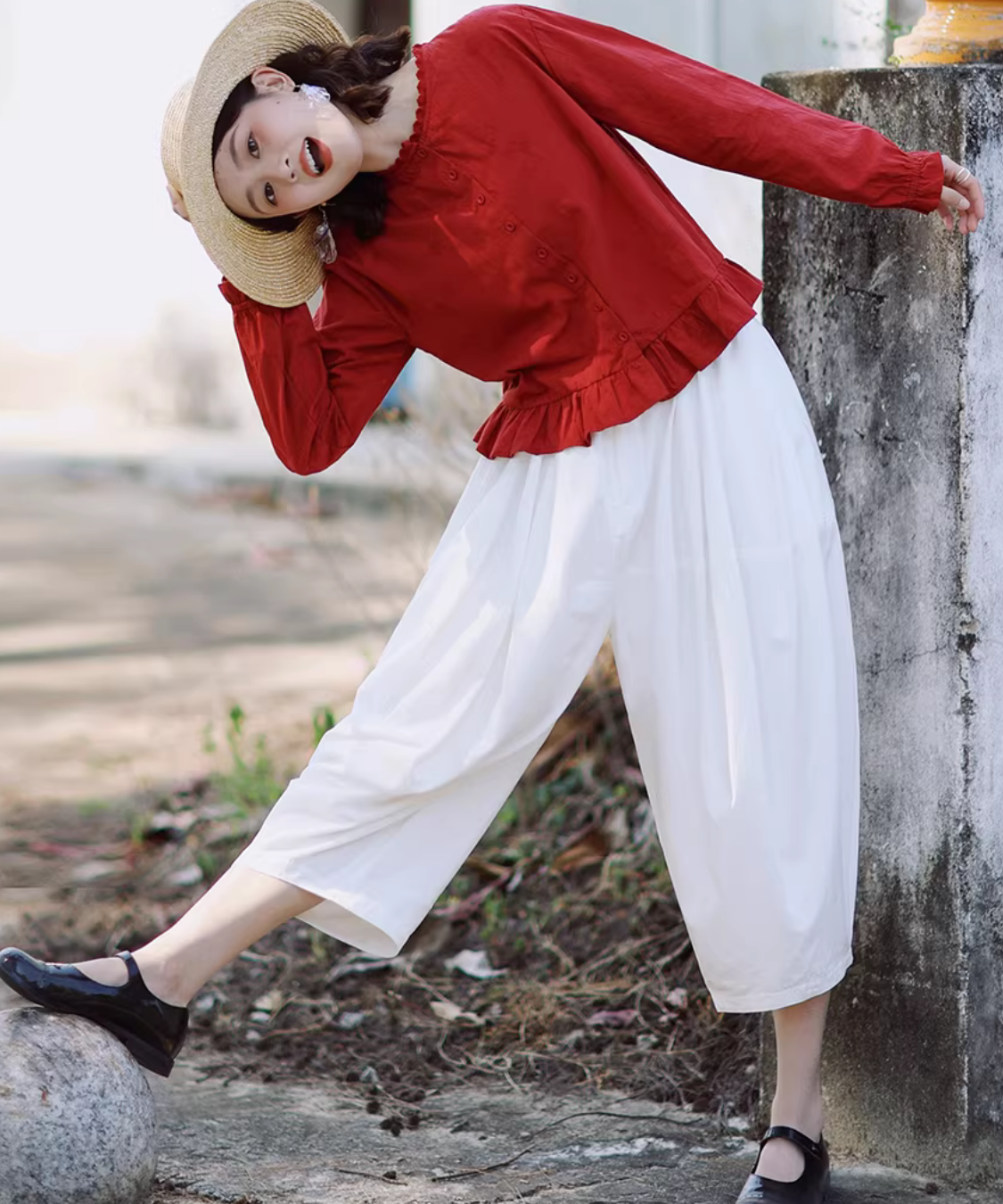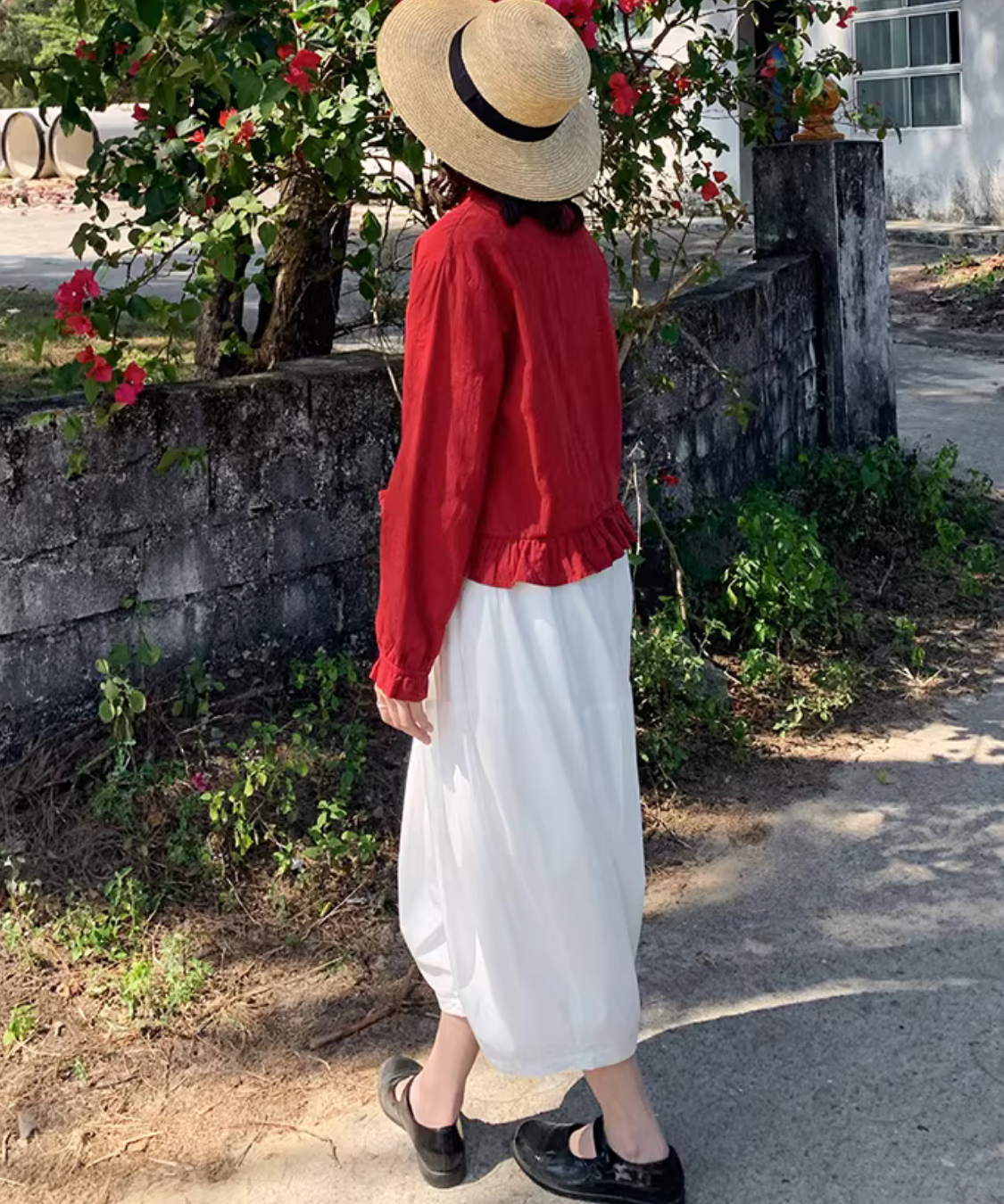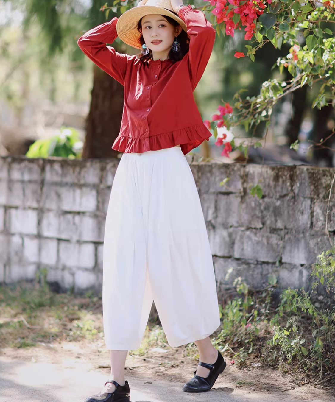 ノーカラーフロントボタン裾フリルブラウス