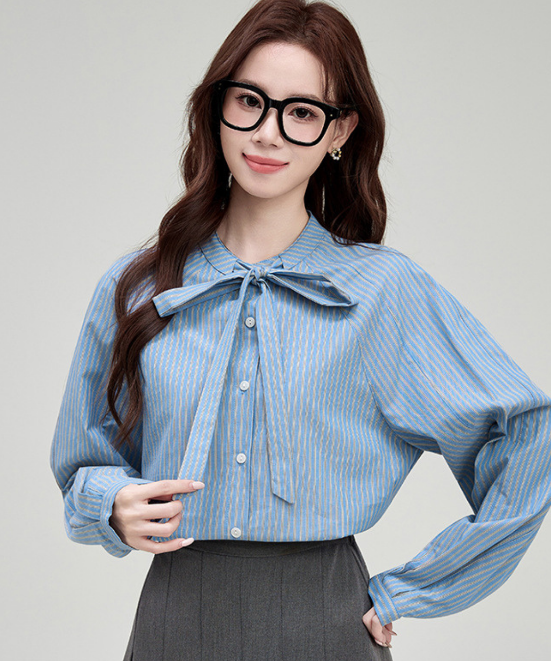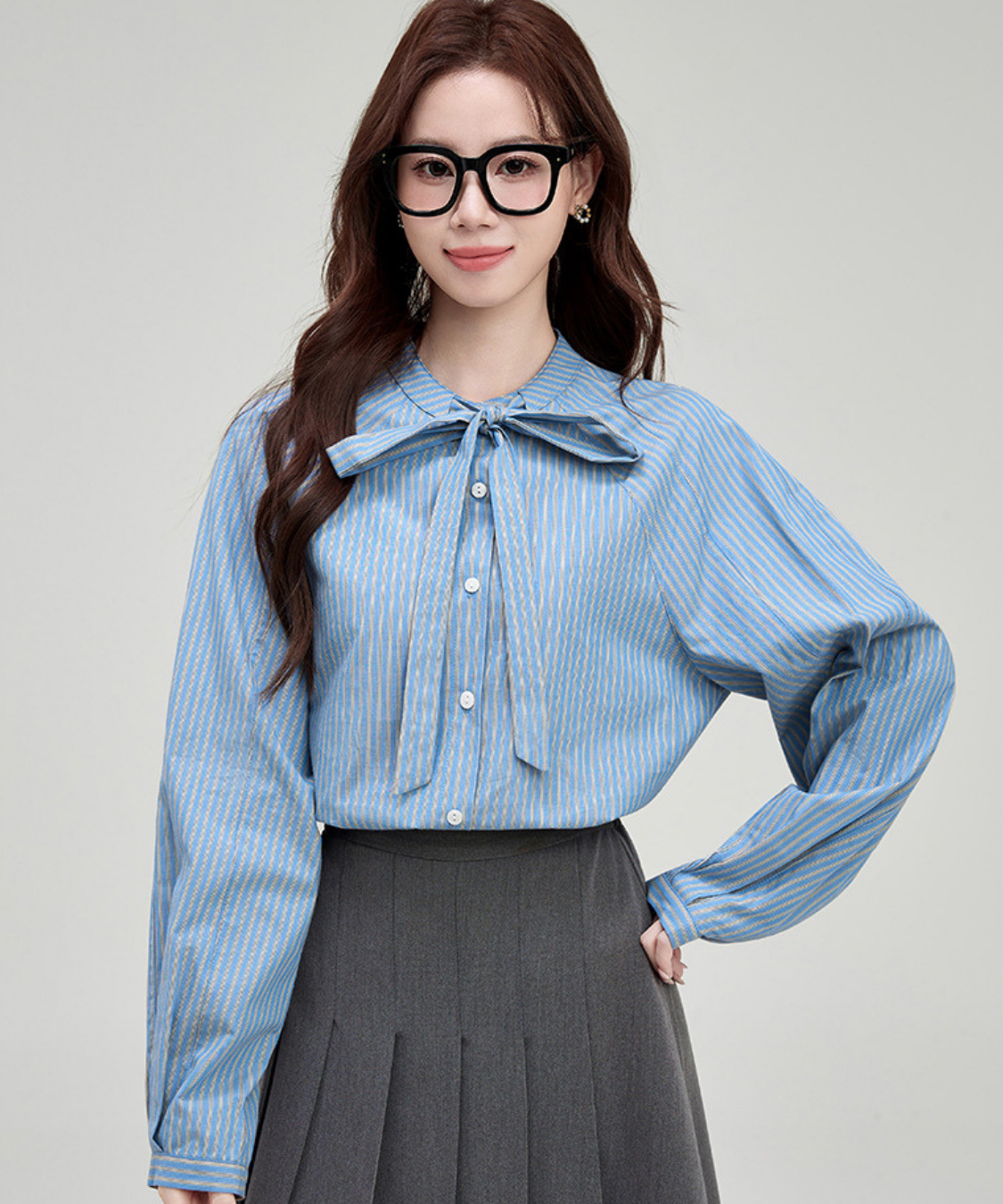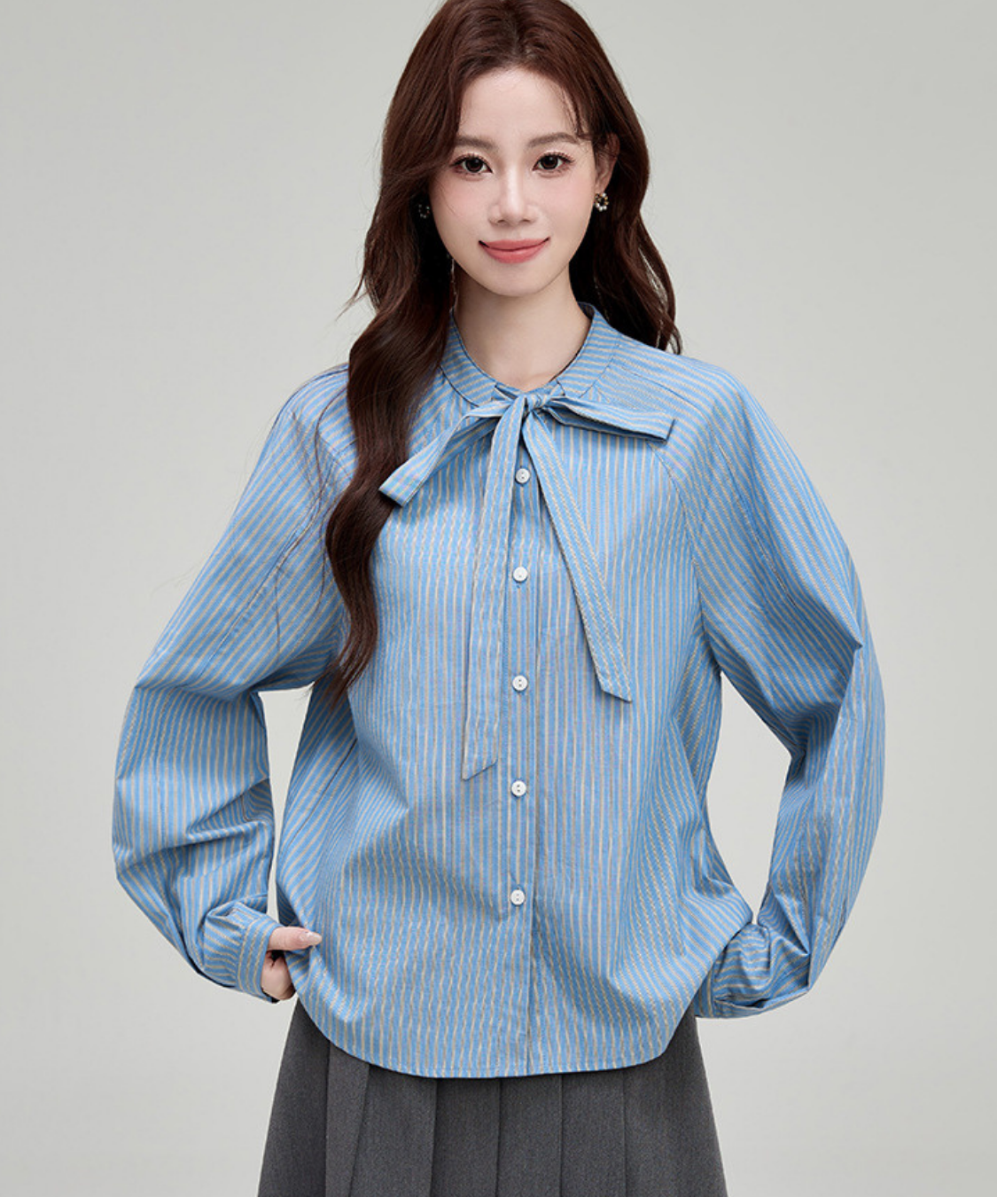 リボンカラーが目を引く、爽やかなストライプ柄のブラウスです。