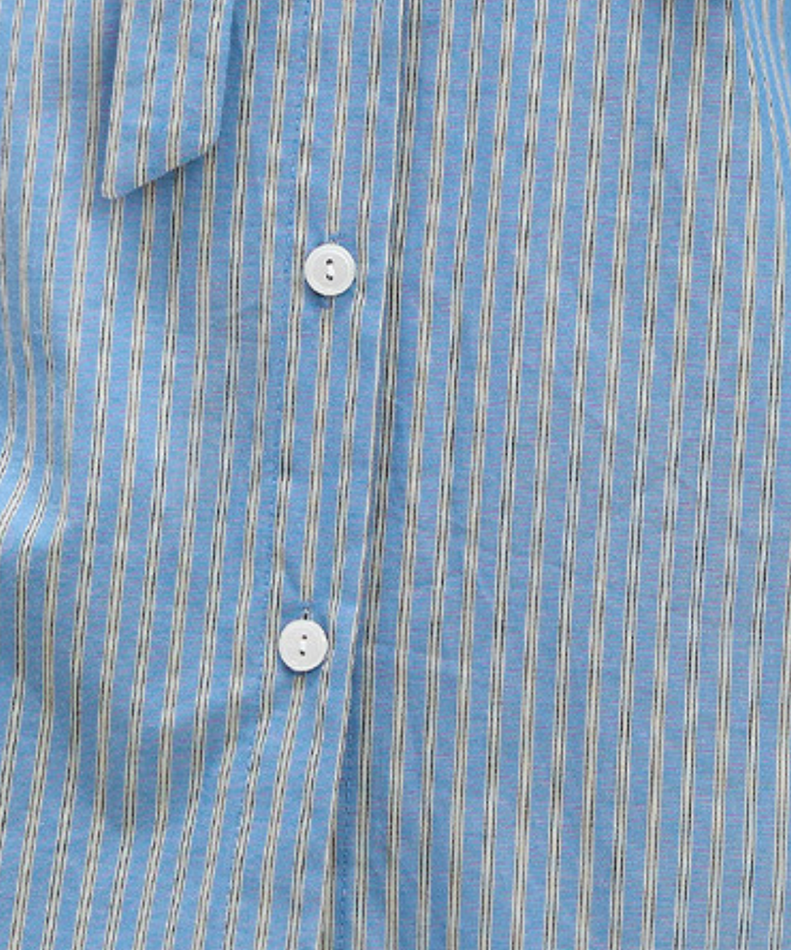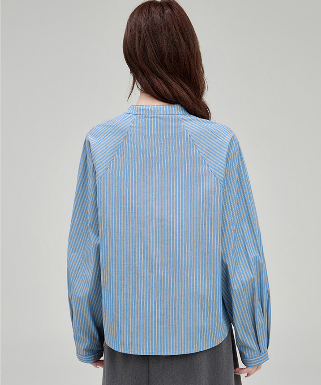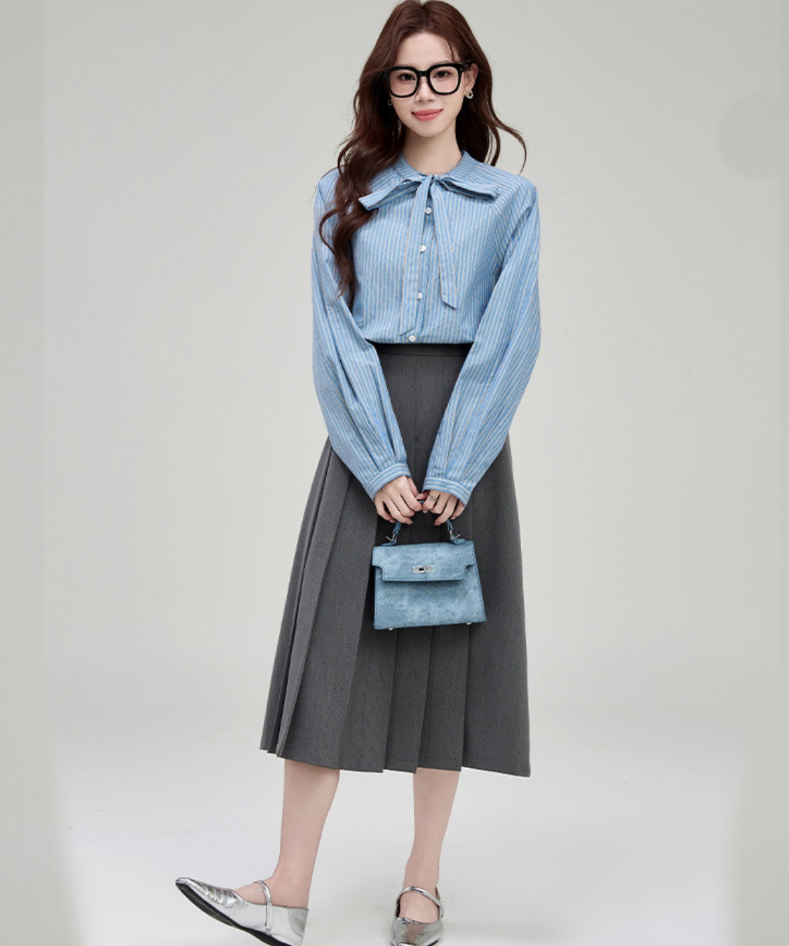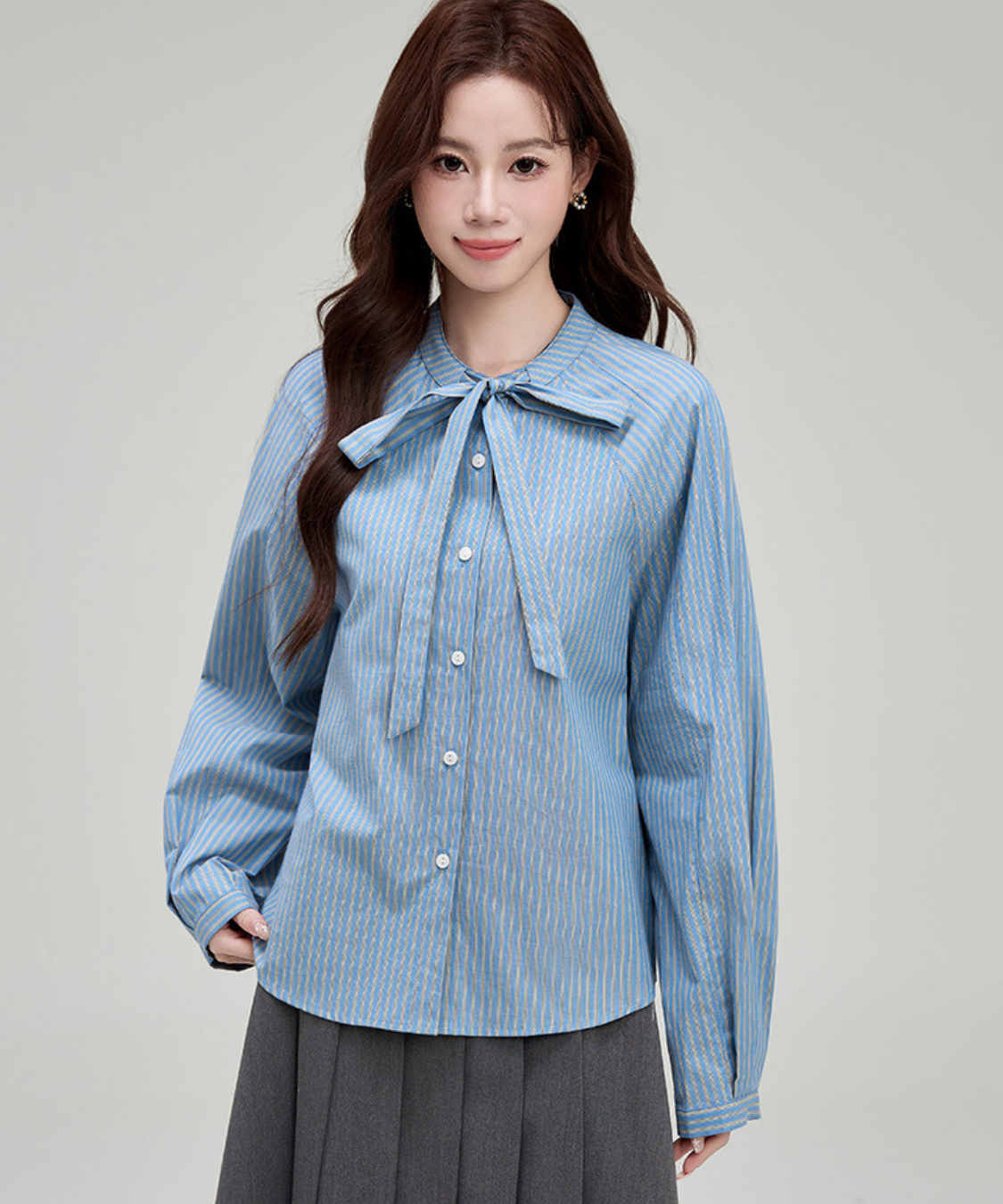 リボンカラーが目を引く、爽やかなストライプ柄のブラウスです。